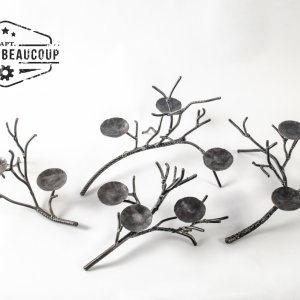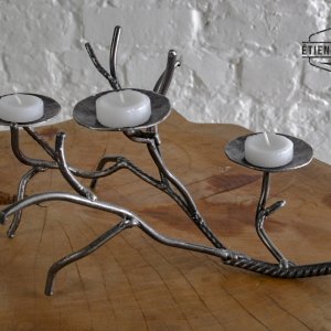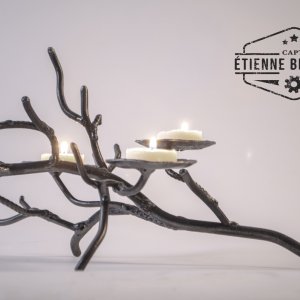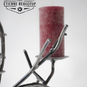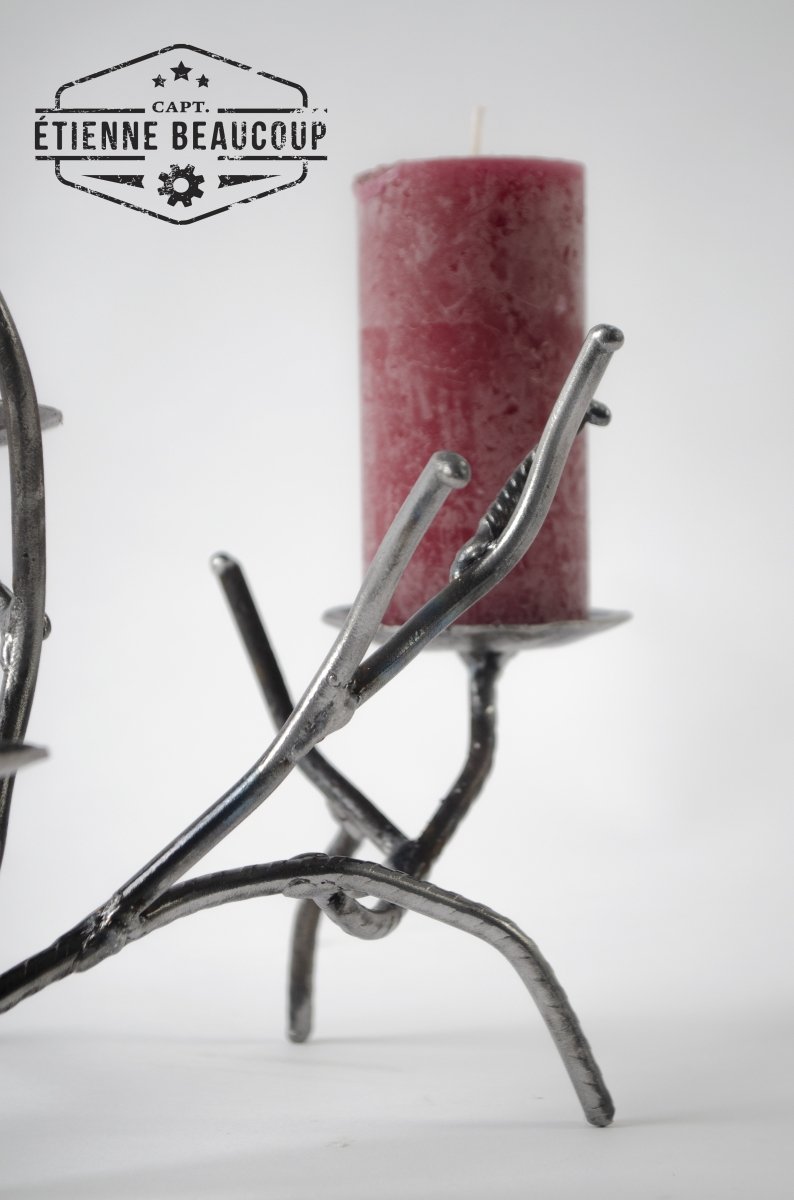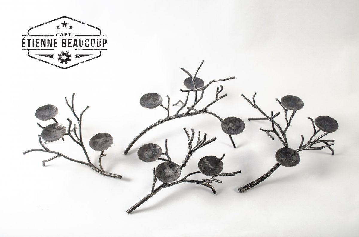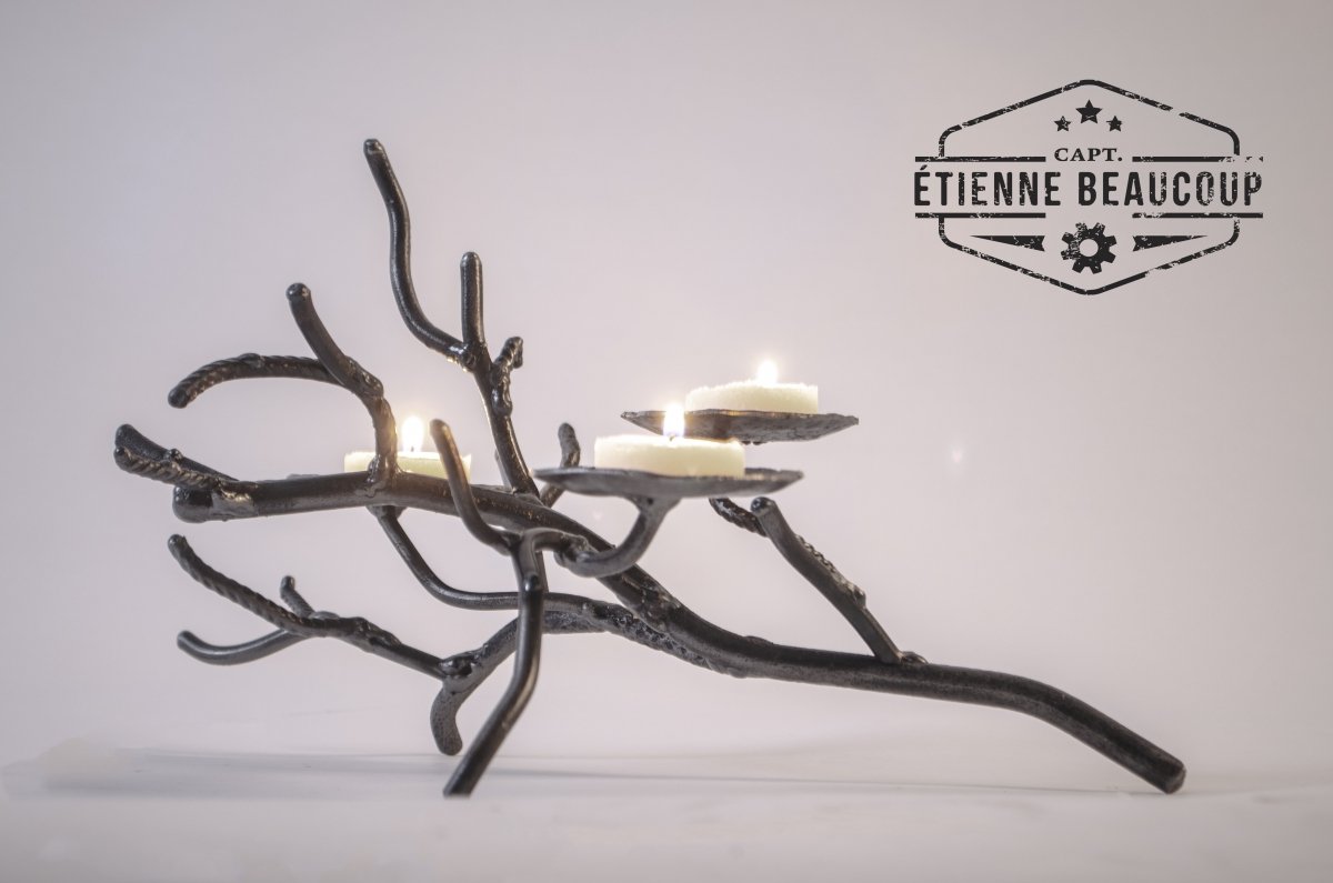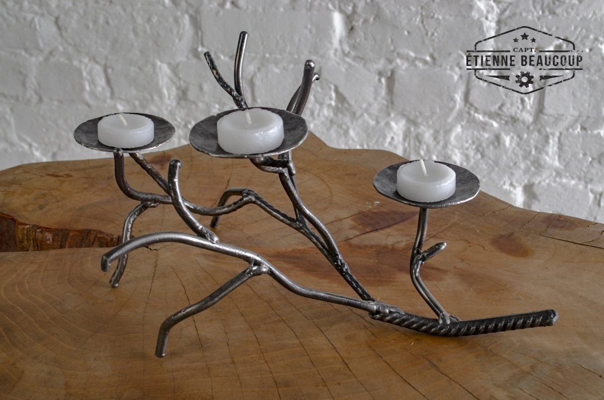 These candleholders in the shape of a branch are made from old concrete rods and weathered metal bars. The dishes are slightly conical and can handle different types of candles.