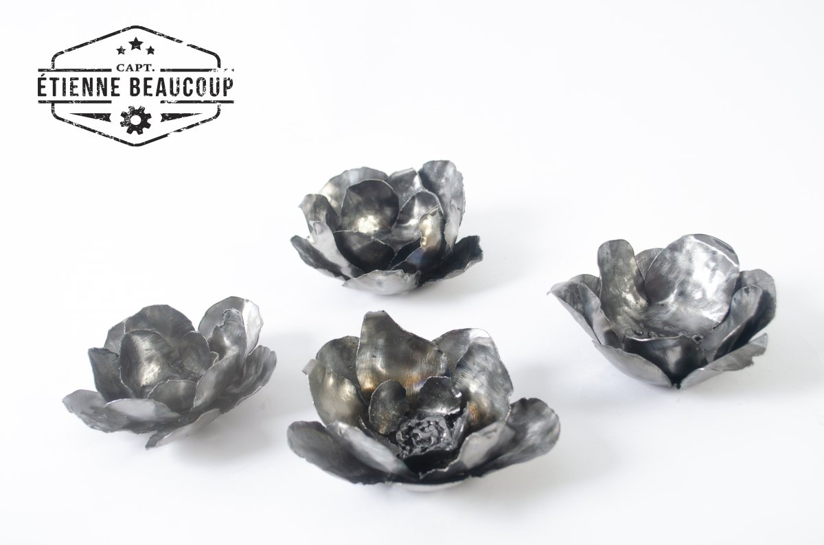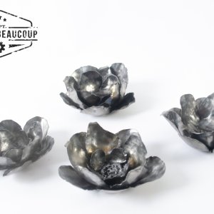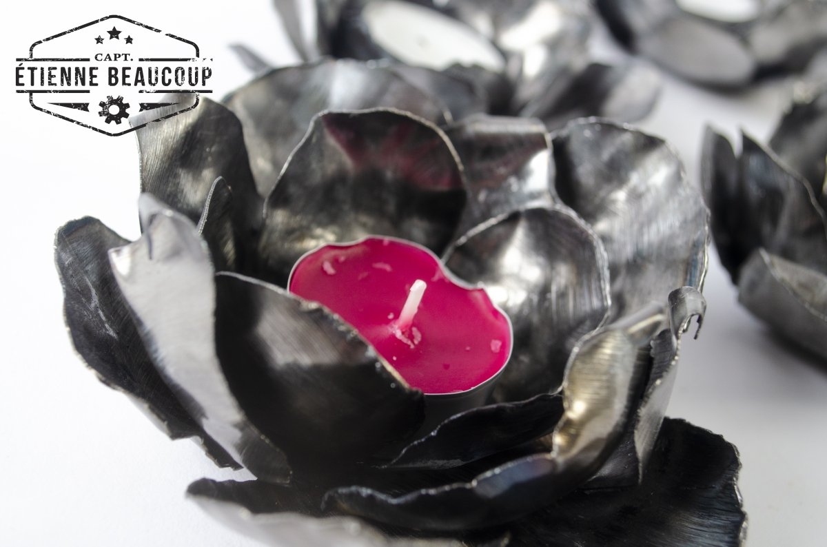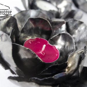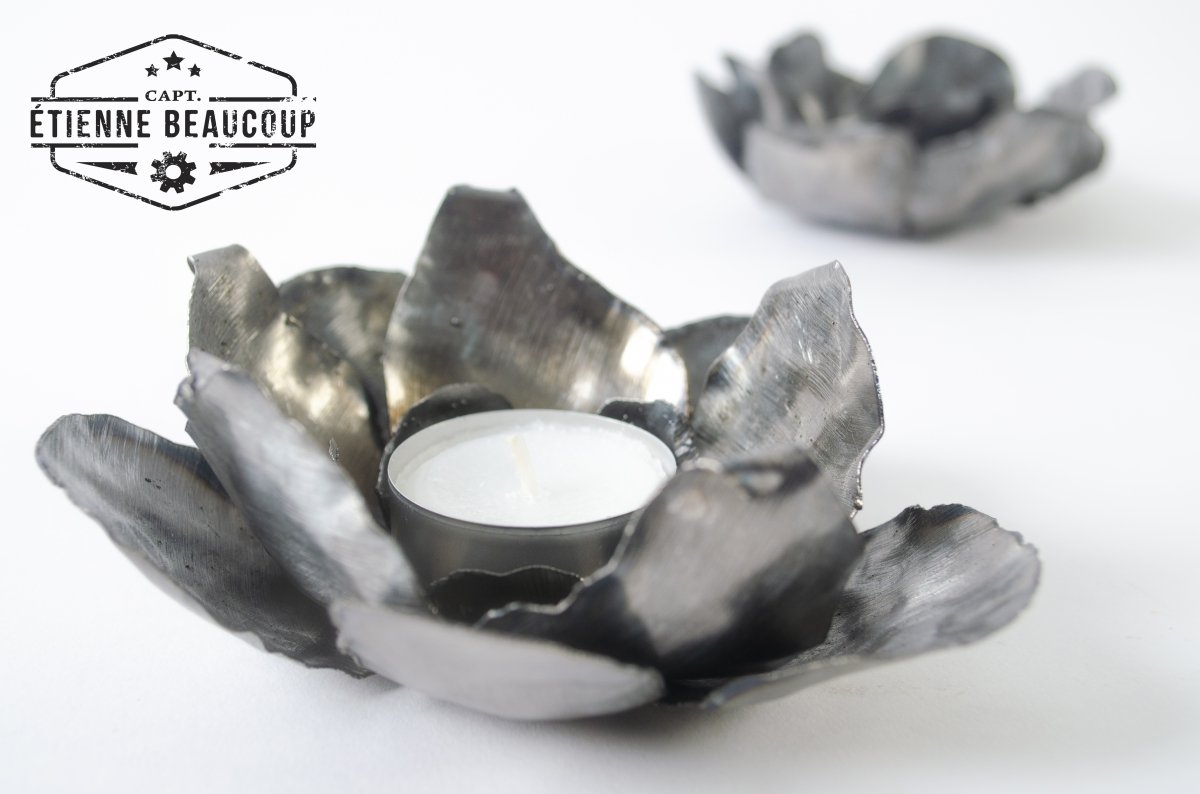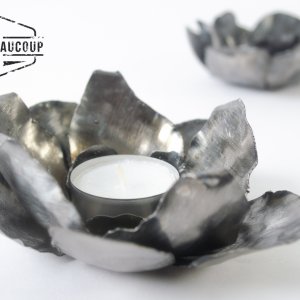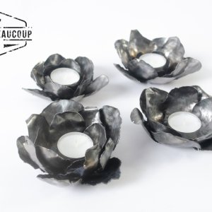 Tea light holder in the shape of a flower, made from a recycled metal plate of a metal storage rack