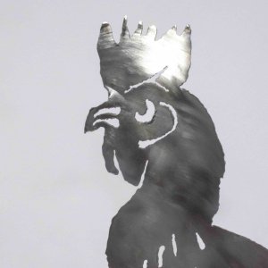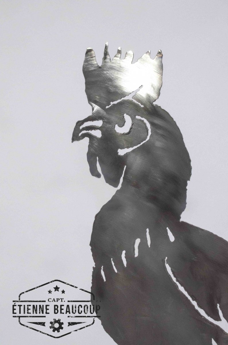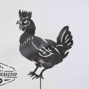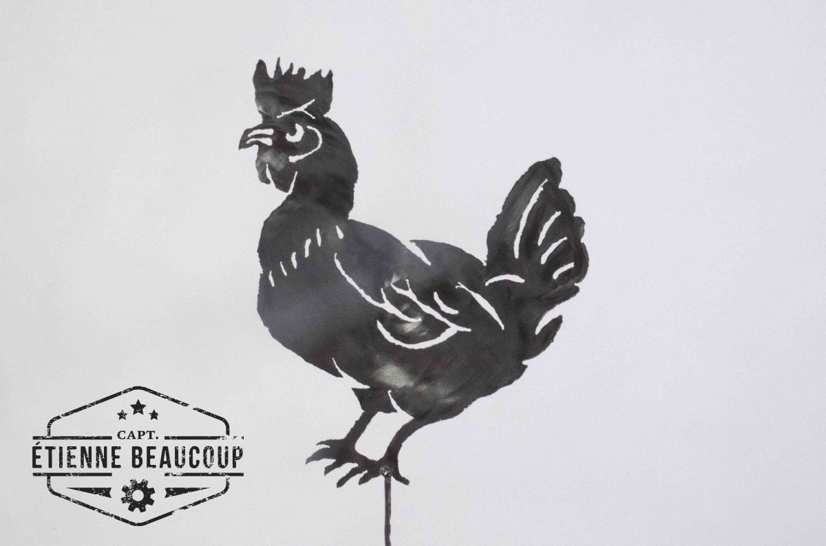 Chicken made out of an old scrapmetal plate. Cutout with a freehand plasmacutter.
