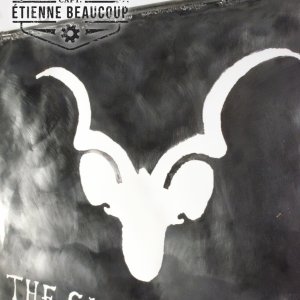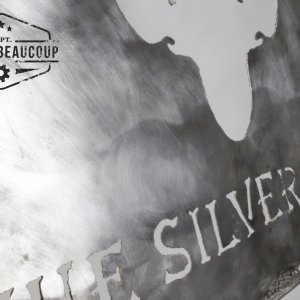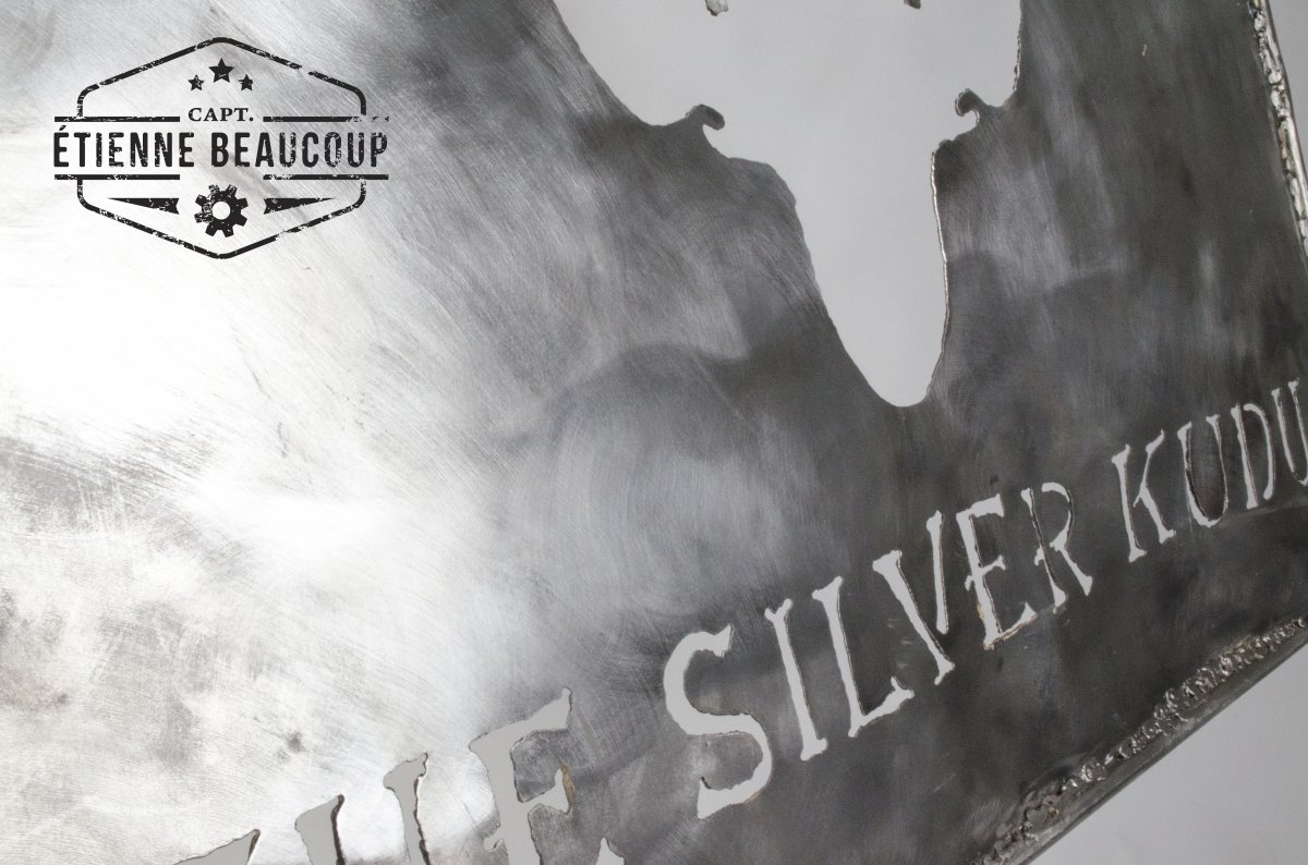 The board is made from waste metals including an old desk and surpluses of rebars. The drawing with the hand was cut out with a plasma cutter. The board will normally get a nice rust by placing it outside. It is three times polished with a pretty rough brush.