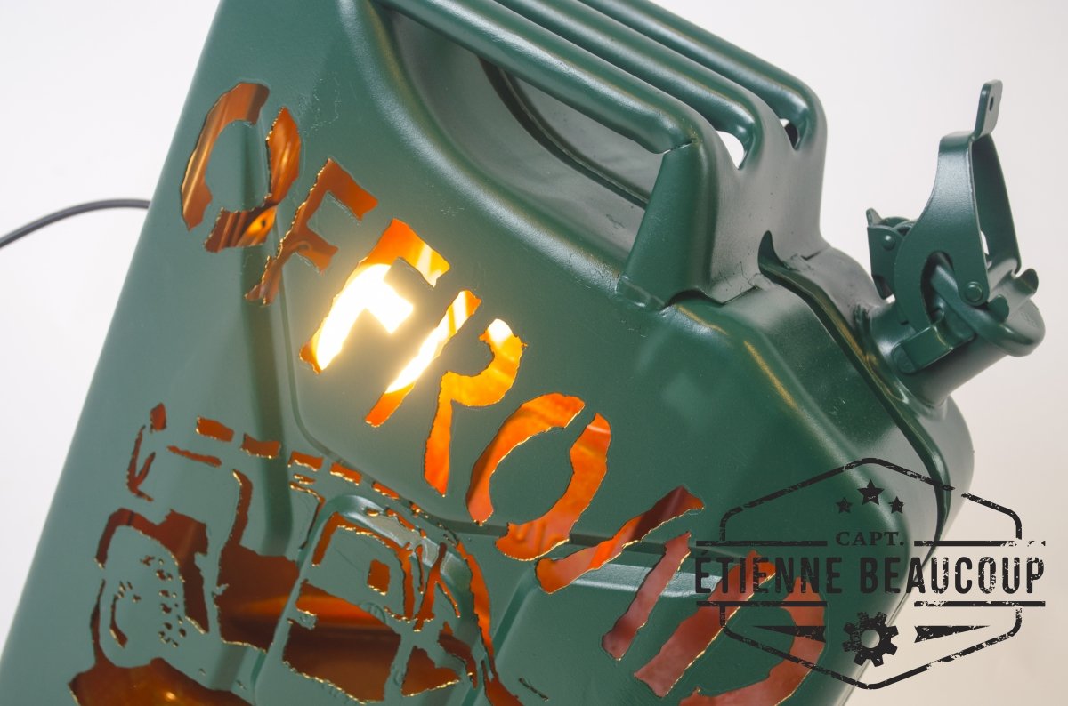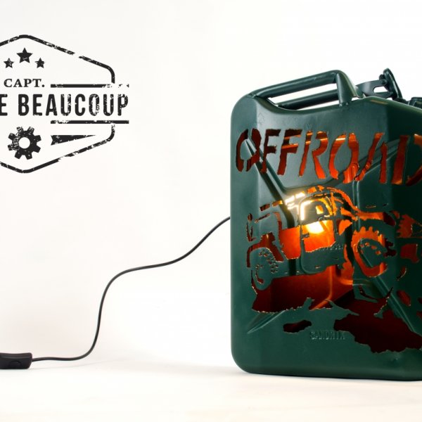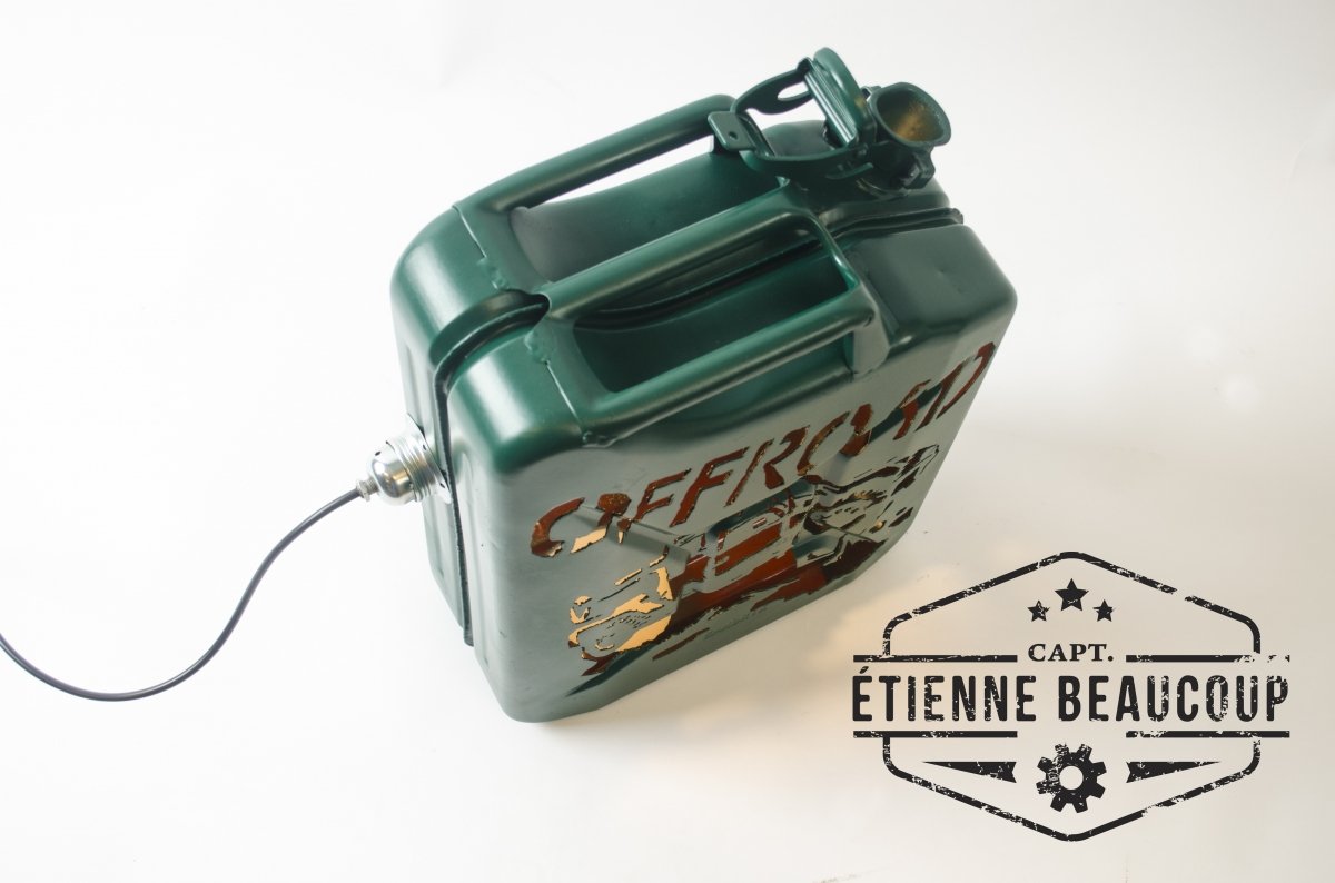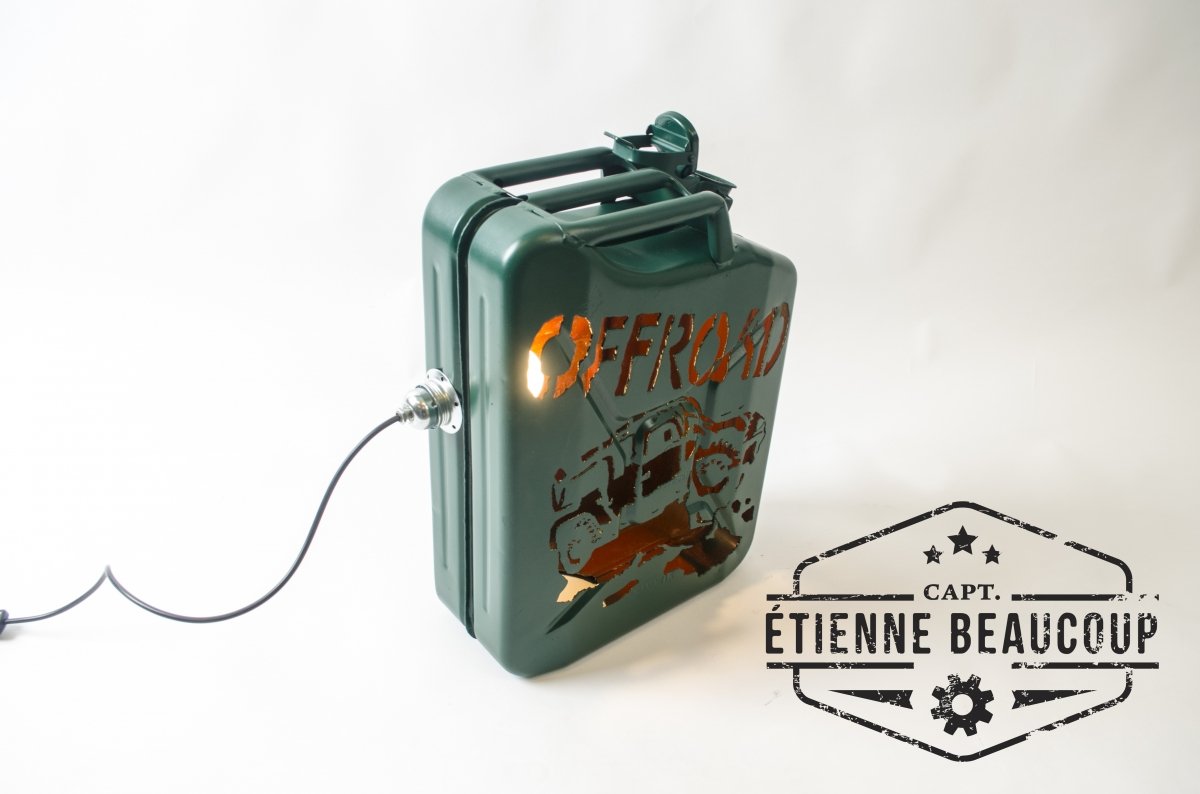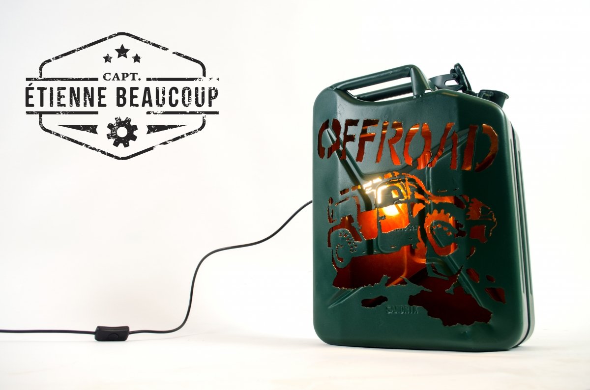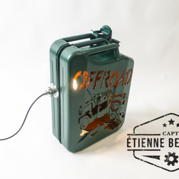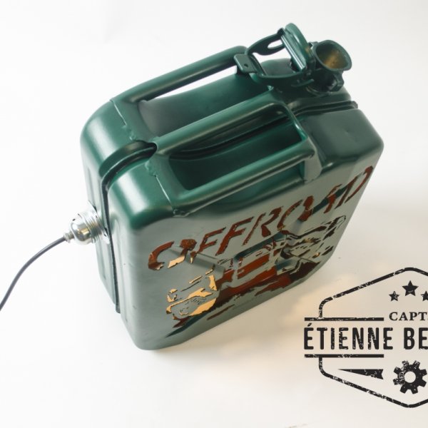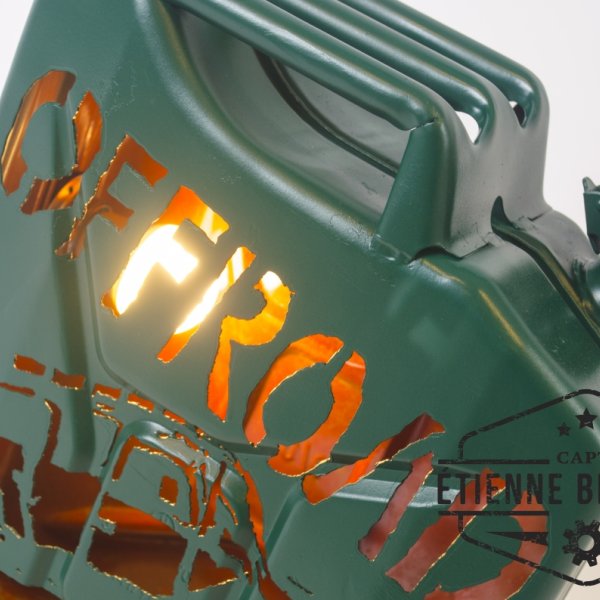 This attractive ambient lamp is made from an old discarded metal fuelcan. The drawing is hand-cutted with a plasmacutter. The roughness of the drawing brings perfectly the offoad feeling indoor.