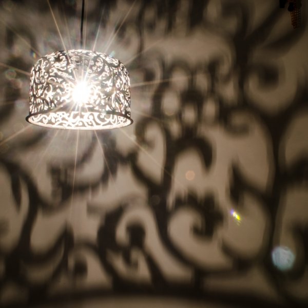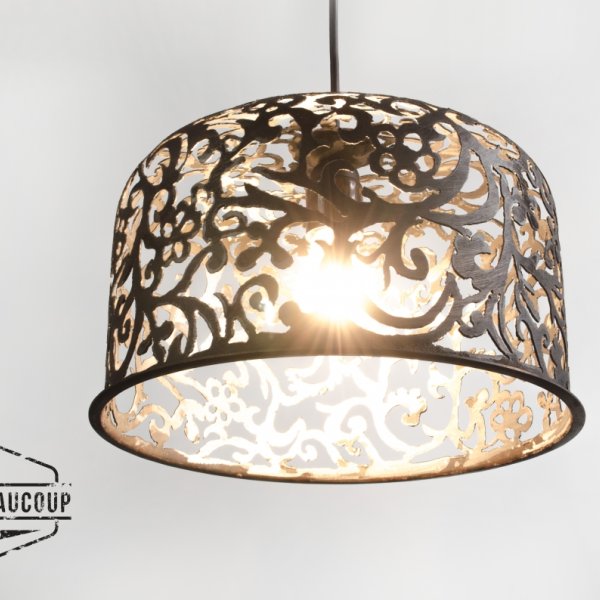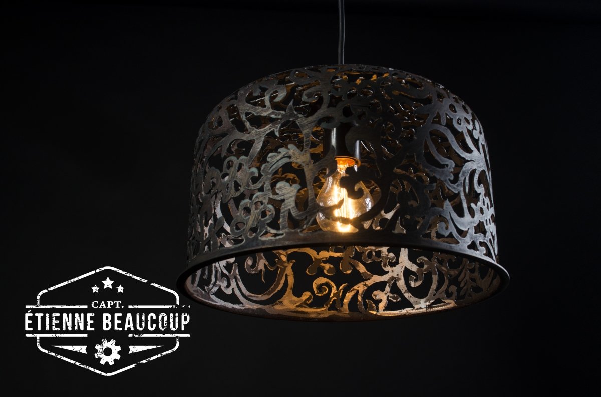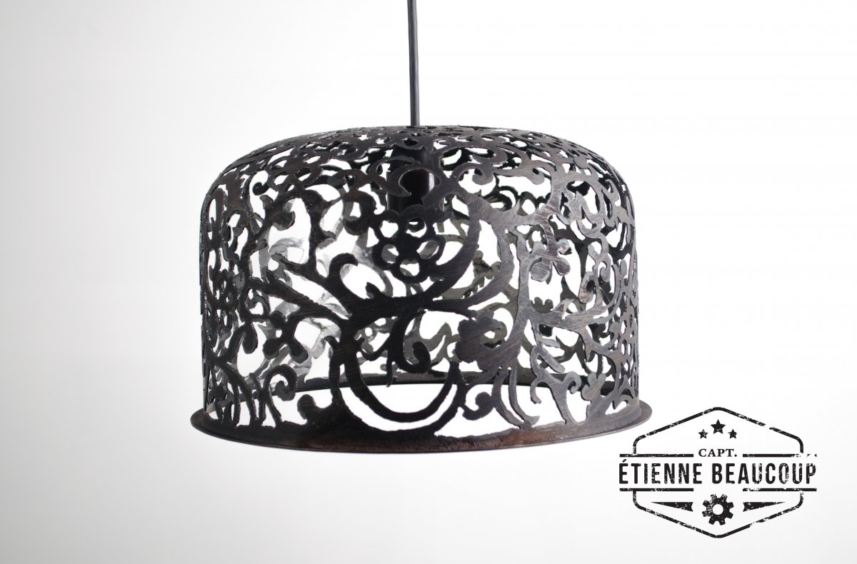 Pendant light made from a recuperated expansion tank. The damask motif was handdrawn and handcutted with the plasma cutter. For finish the lamp was not sanded or grided and gives a very industrial feeling.