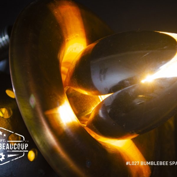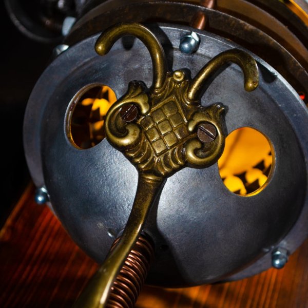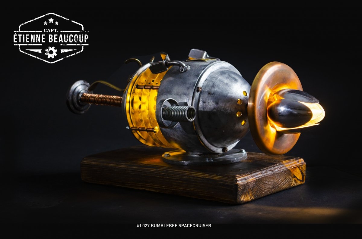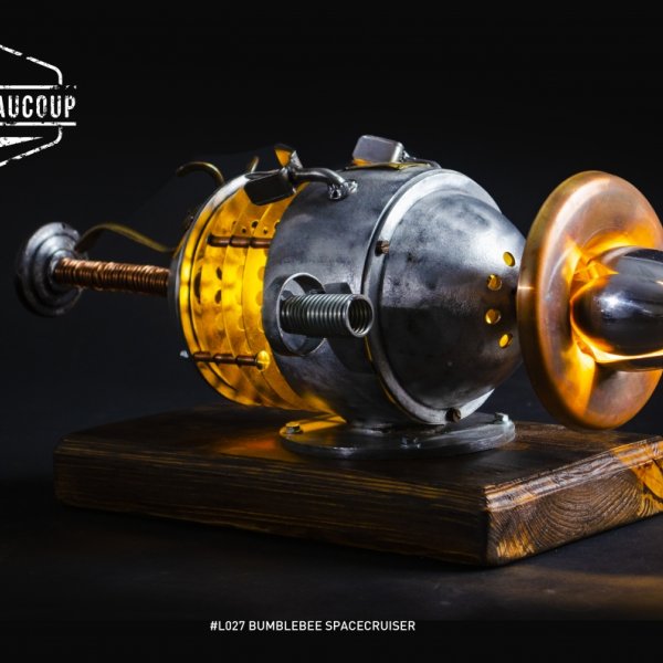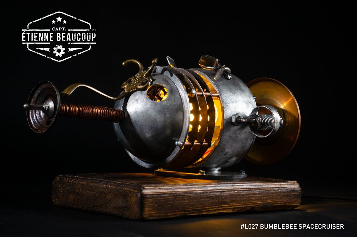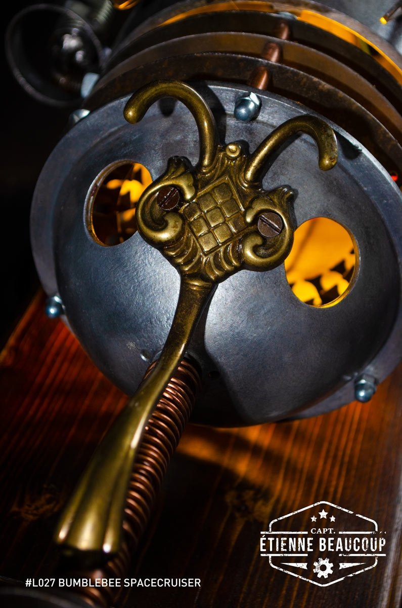 This mood lamp in the shape of a spaceship and the looks of a beetle or bumblebee is composed of all kinds of found parts such as an old electric motor, spoons, coat rack and more.