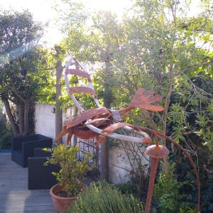 This bird from found objects turns with the wind.