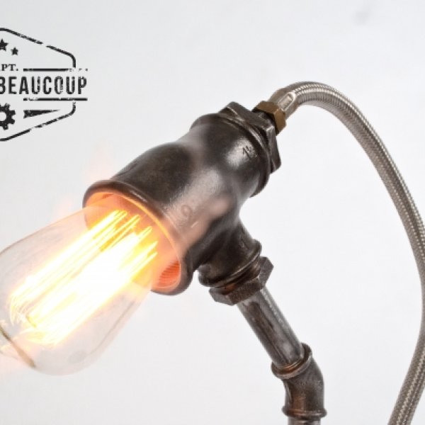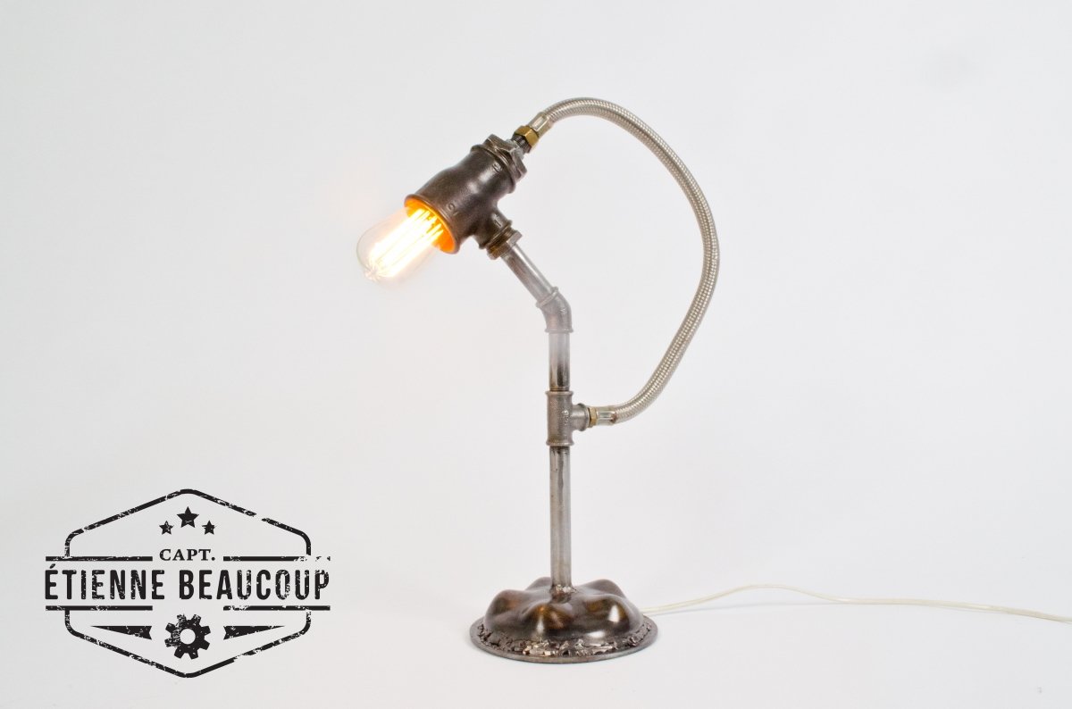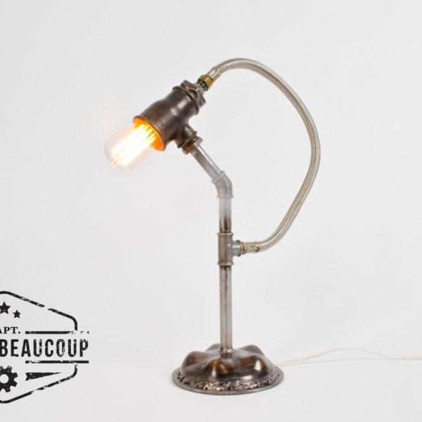 Outdoor table made from heating pipes, reclaimed decking and old cement tiles.