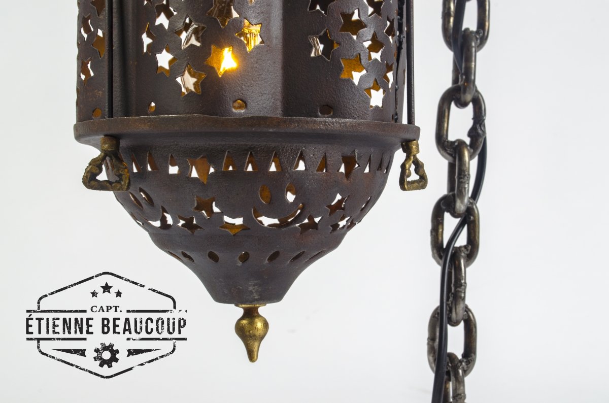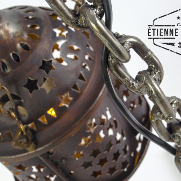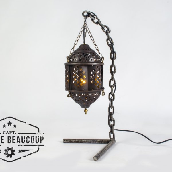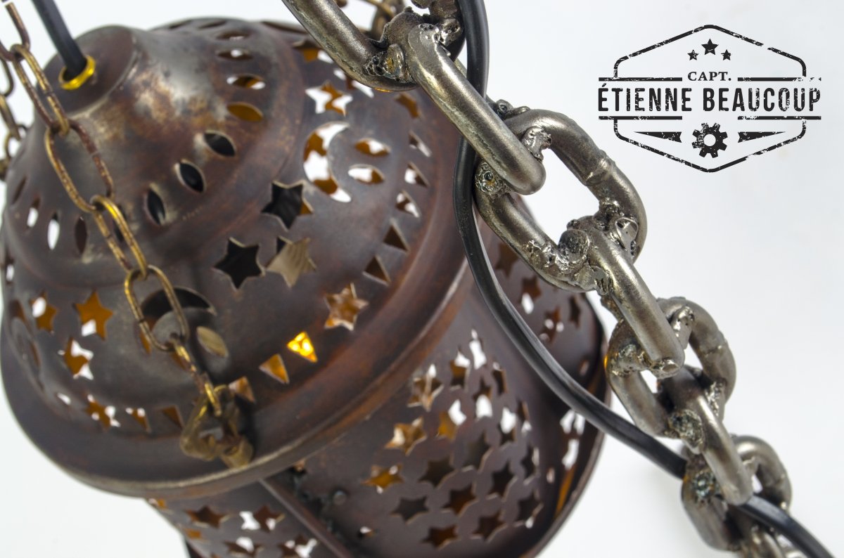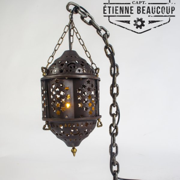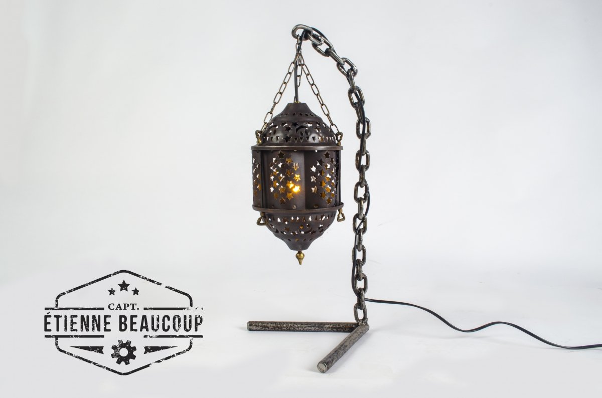 An old chain became the base of this lamp. The welded links provided a nice stand. The stand was finished a while ago, but I did not immediately have an idea what I would use as a lamp. Until I was cleaning up my whorkshop and found this beautiful old lampshade, It was once a friend's gift when he moved.