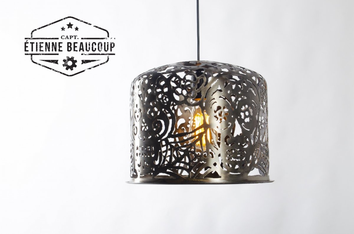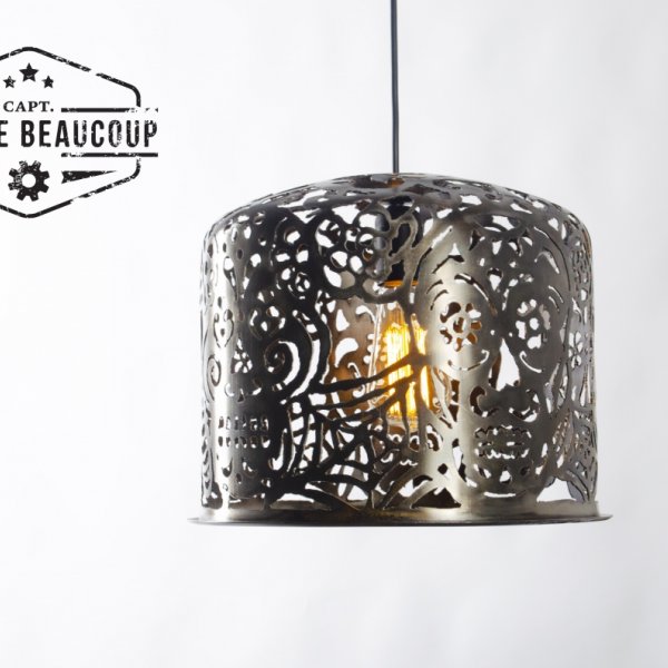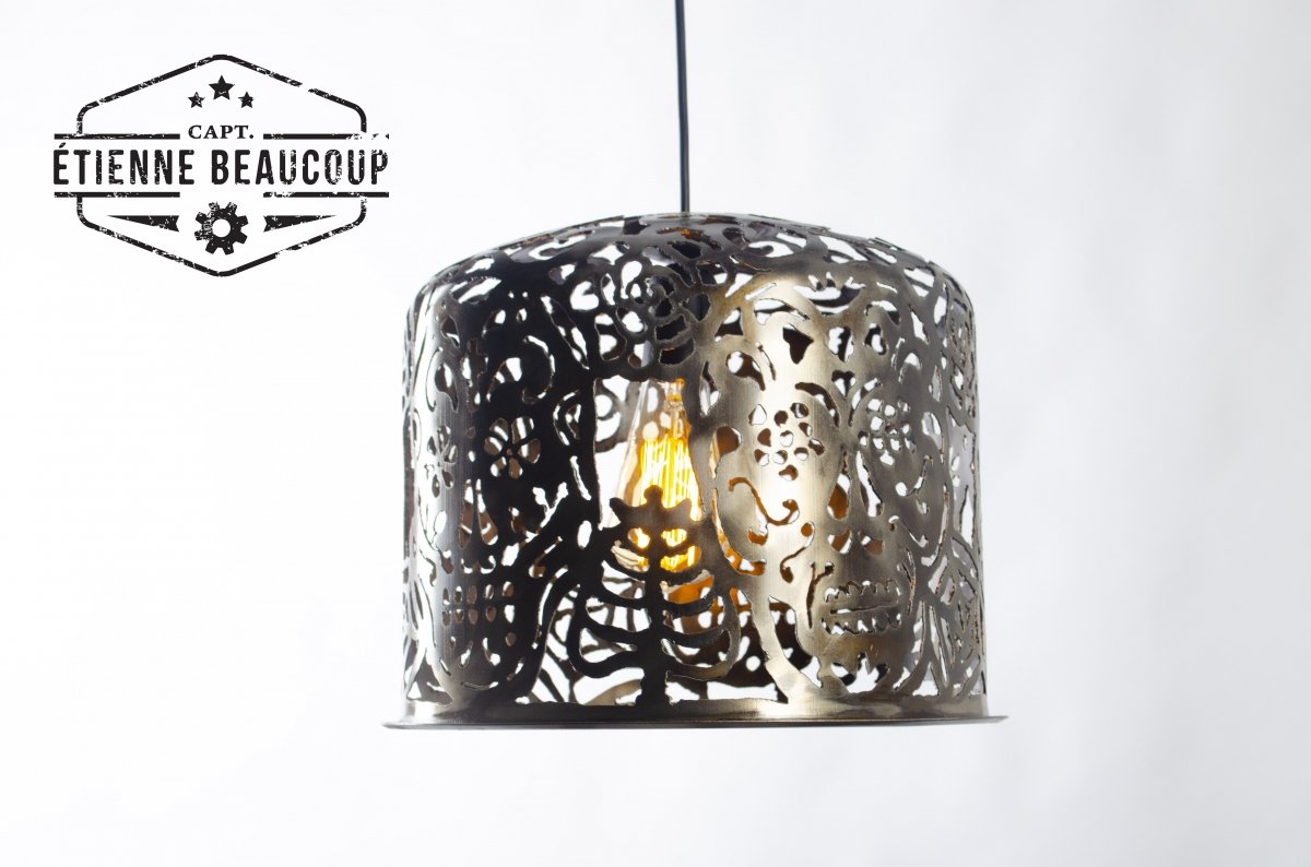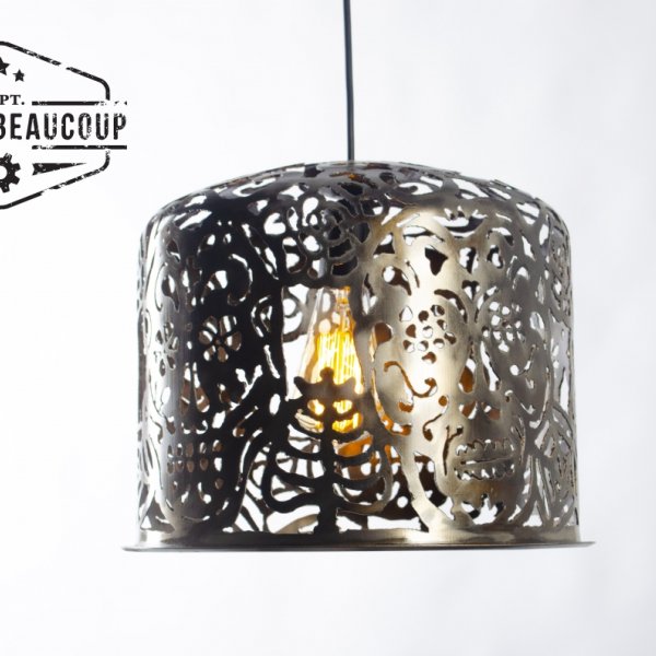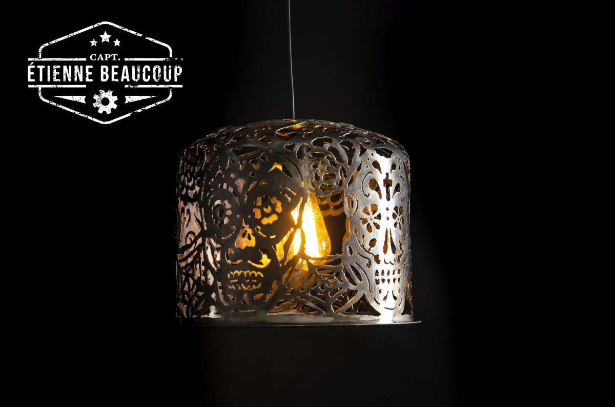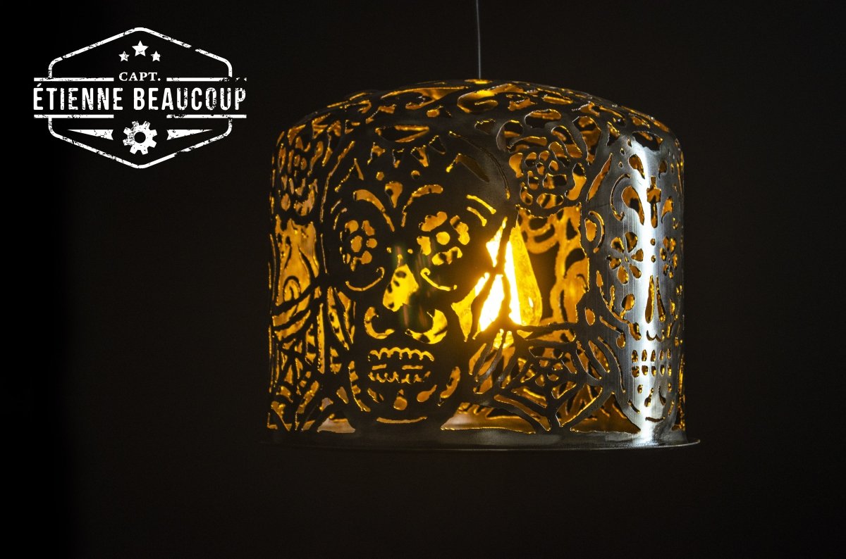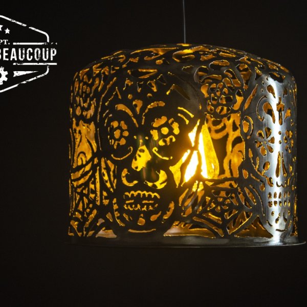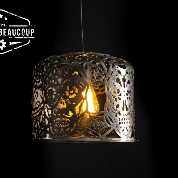 Pendant Lamp from half of an expansion vessel with Mexican skulls,flowers and curls. The hand drawn and cut with the plasma cutter. Día de los Muertos is a Mexican holiday that honors our ancestors and loved ones who have passed.