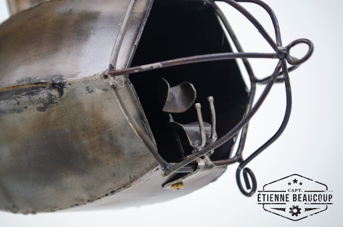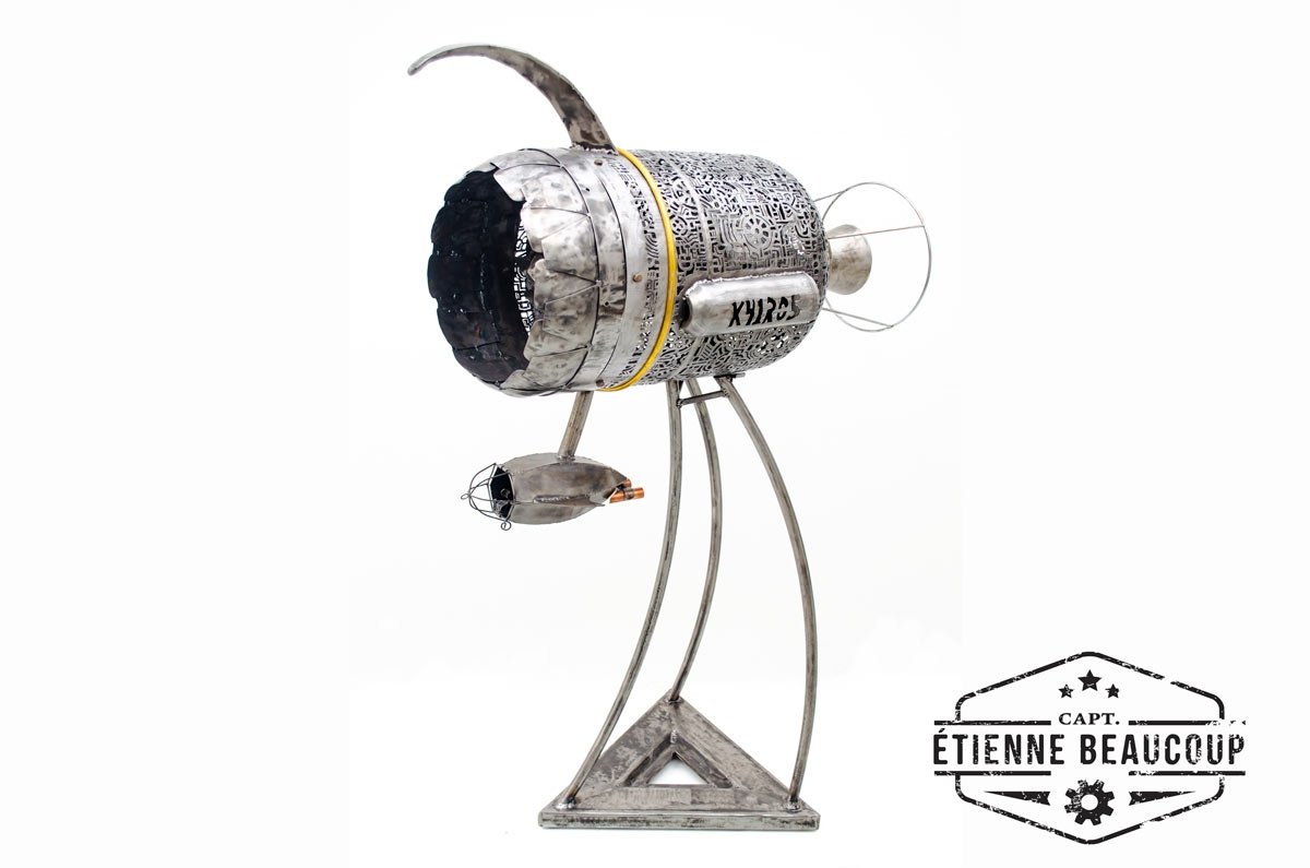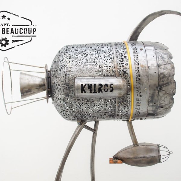 Geheel opgebouwd uit recuperatie metaal. Her ruimteschip bevat een bewegingsdetector en start radom bij detectie.