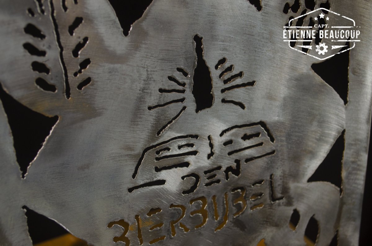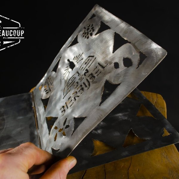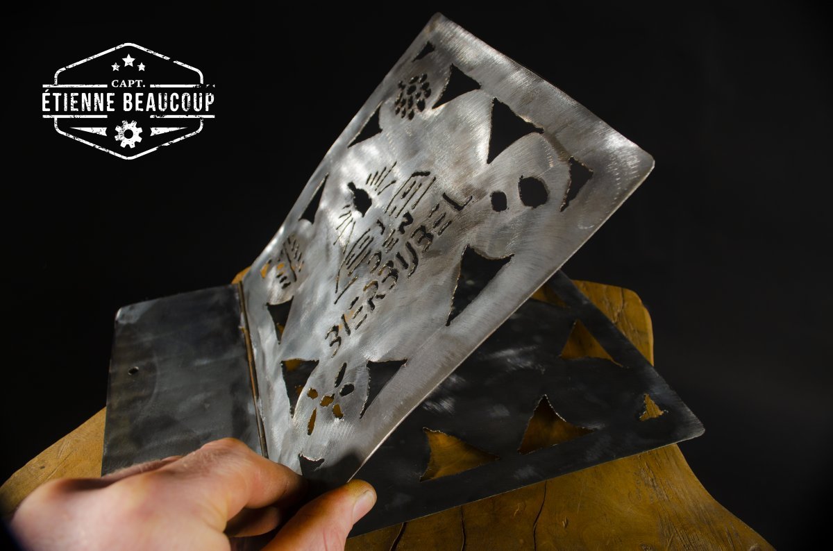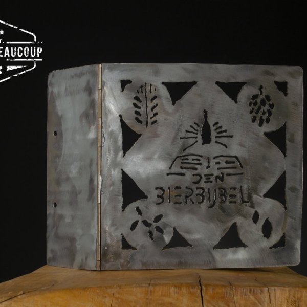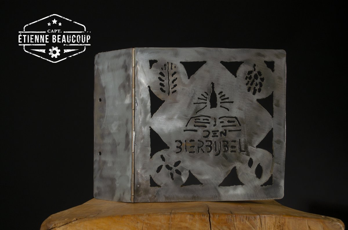 Deze metalen omslag is op vraag gemaakt om de bierbijvel van café Bluenote in halle in onder te brengen. De cover is gemaakt uit gerecupereerde metalen legplanken en is met de hand uitgesneden met de plasmacutter.