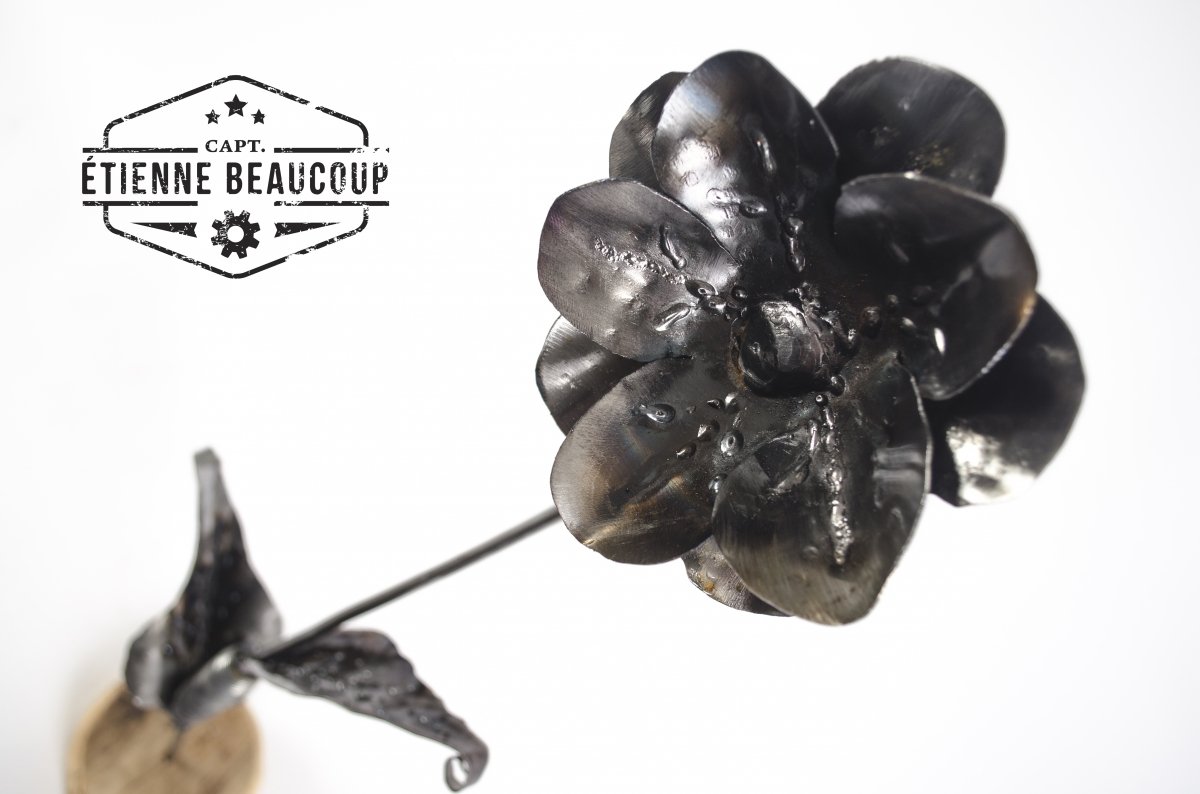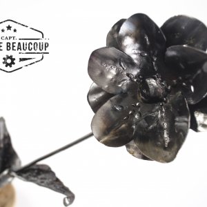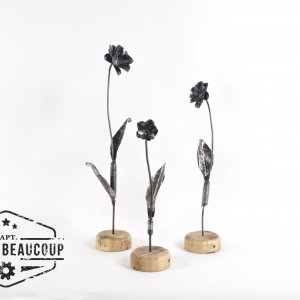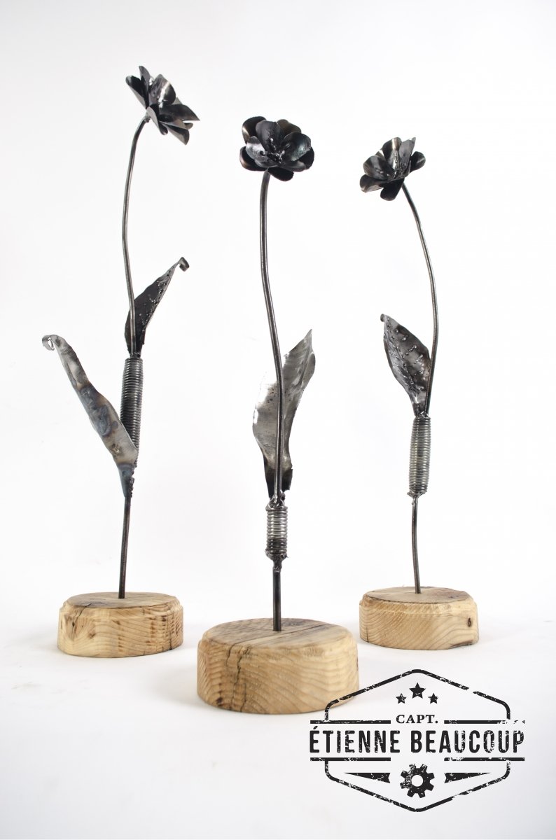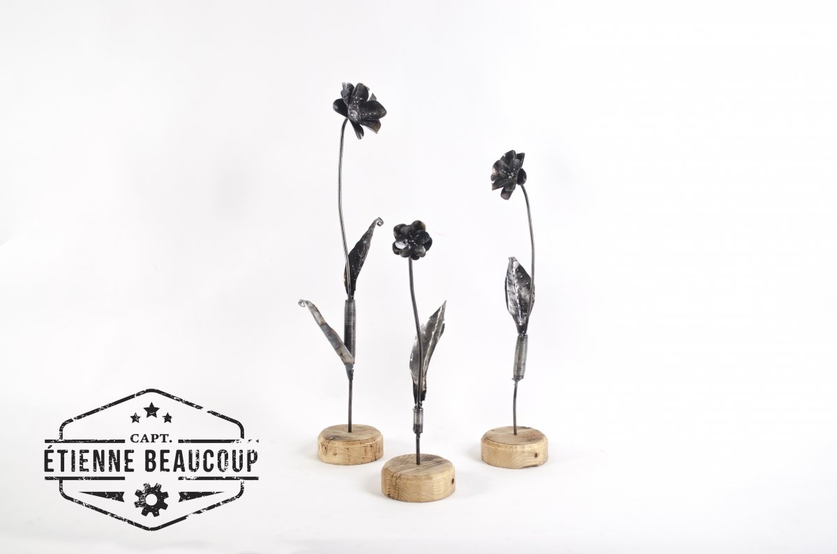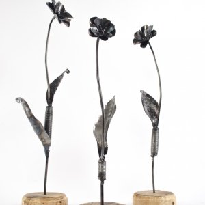 Deze decoratieve bloemen werden gemaakt uit een versleten verkeersbord. De steel zijn hergebruikte betonijzers. De voet is een stukje oud steigerhout.
