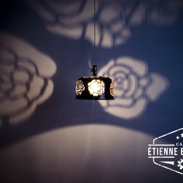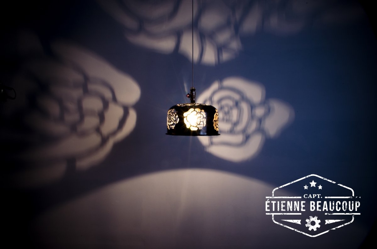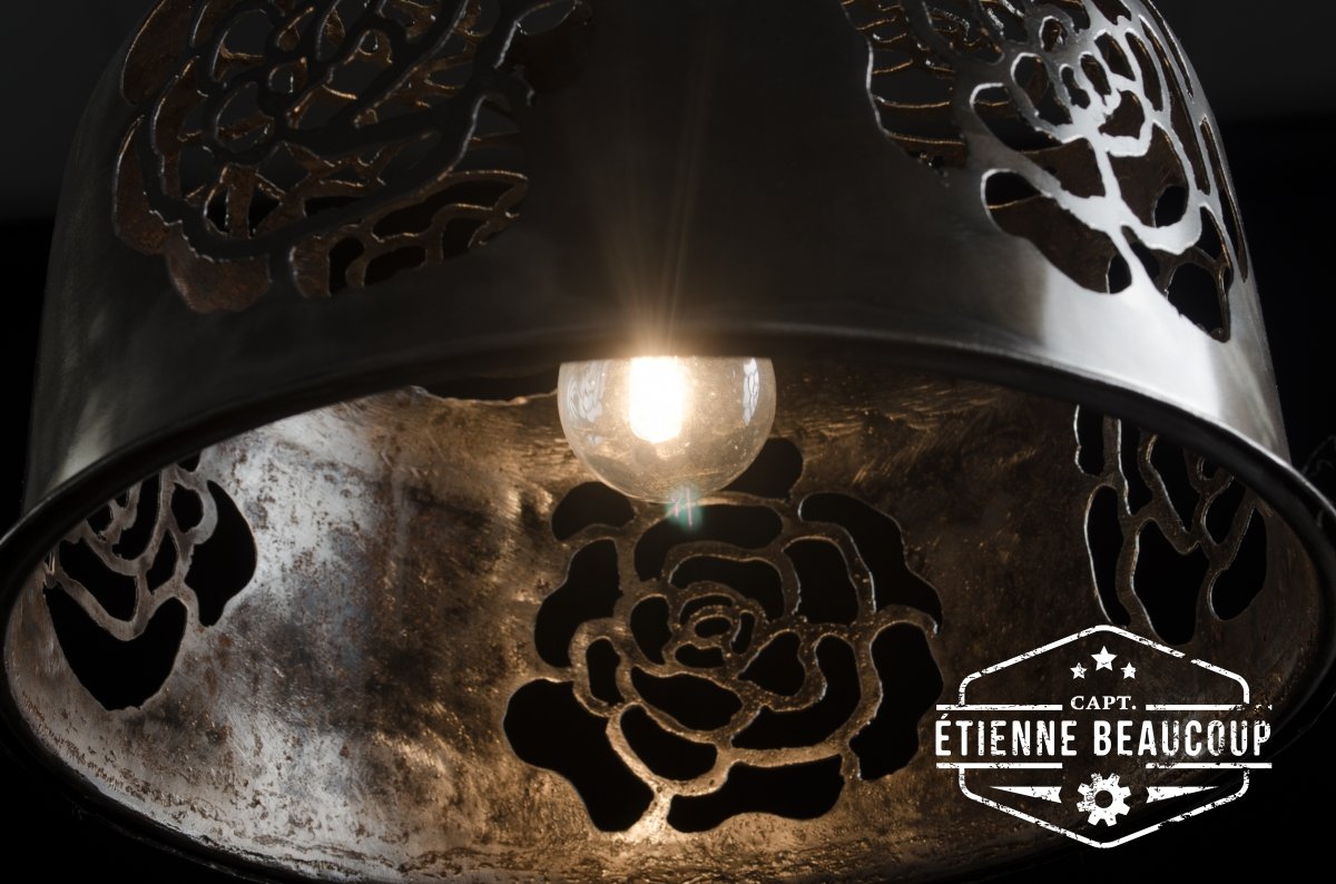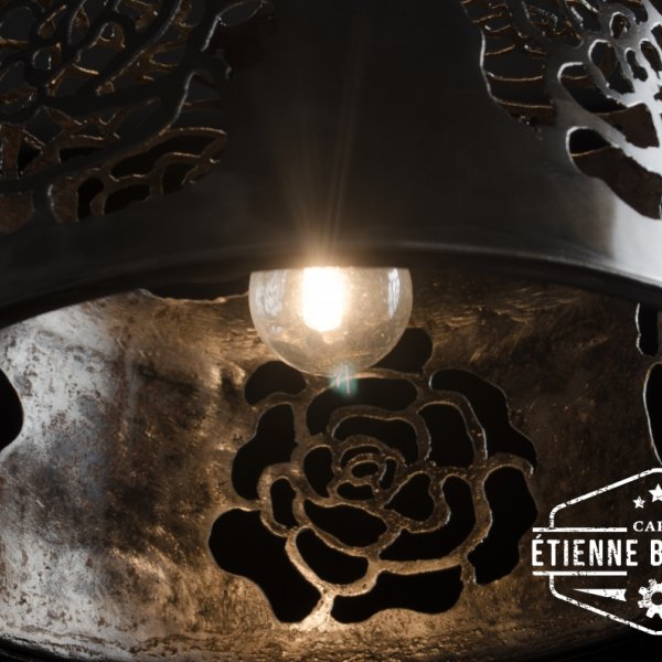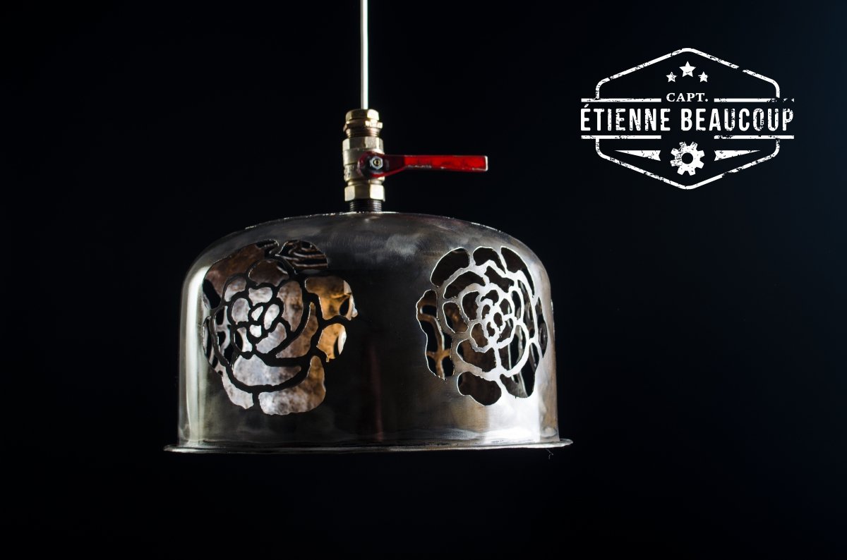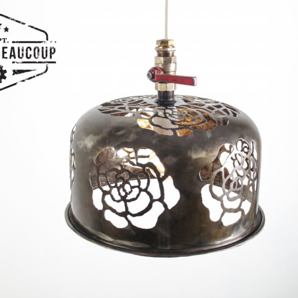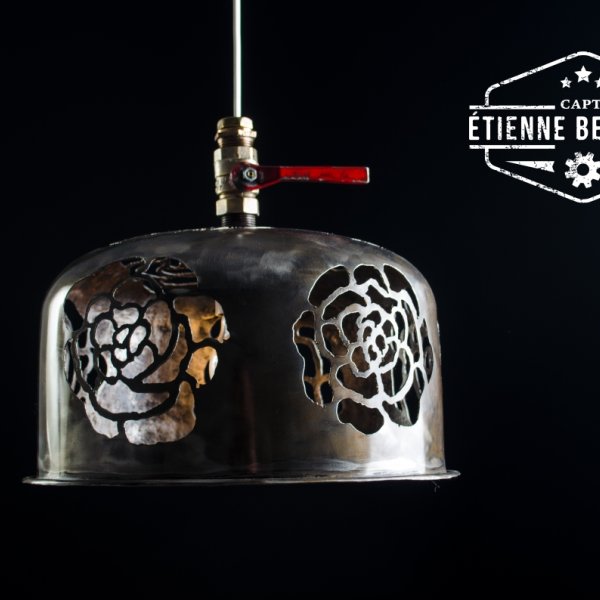 Deze hanglamp met rozenmotiew werd gemaakt uit de helft van een oud expansievat. De rozen werden met de hand uitgesneden met een plasmacutter. Ter versiering werd er een oude sanitaire kraan op bevestigd.
