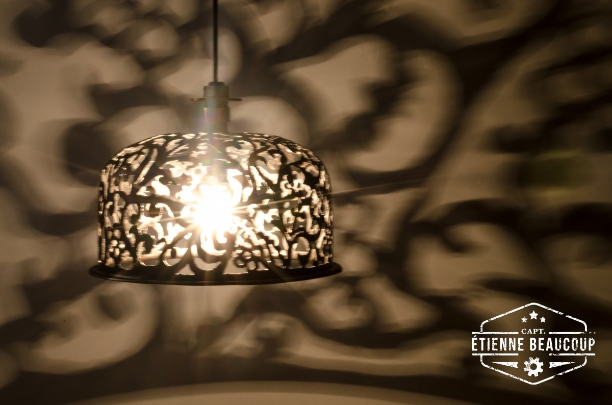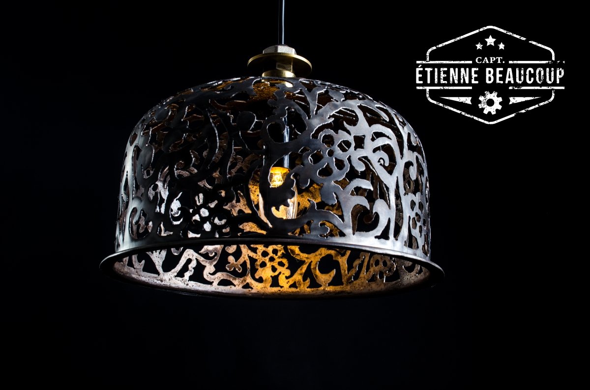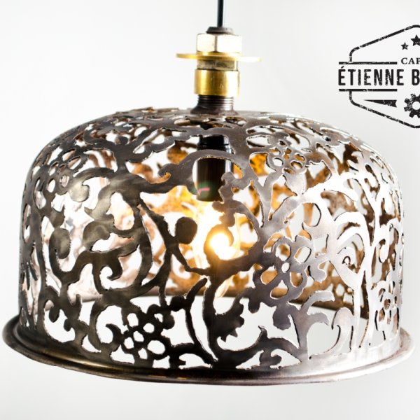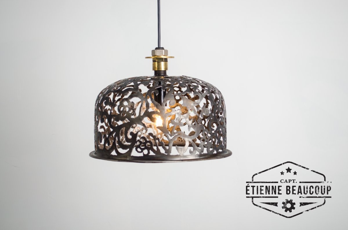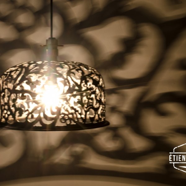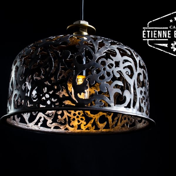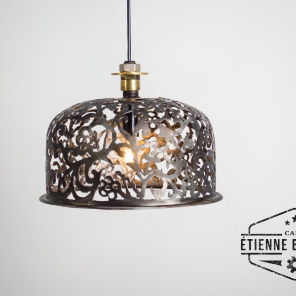 Deze hanglamp uit een oud expansievat heeft een met de hand uitgesneden damask motief.