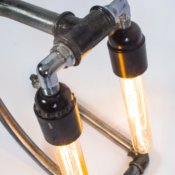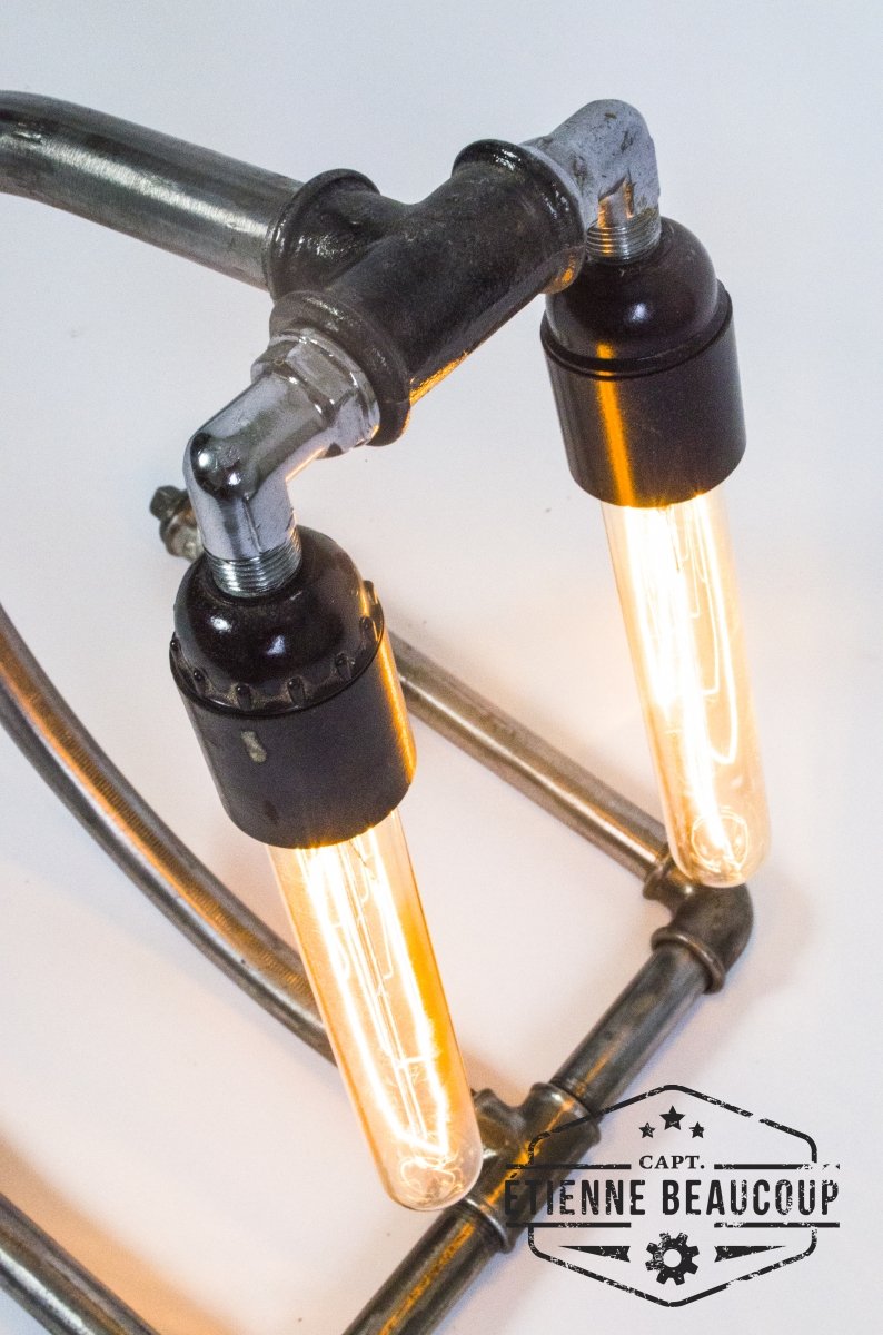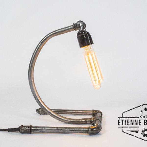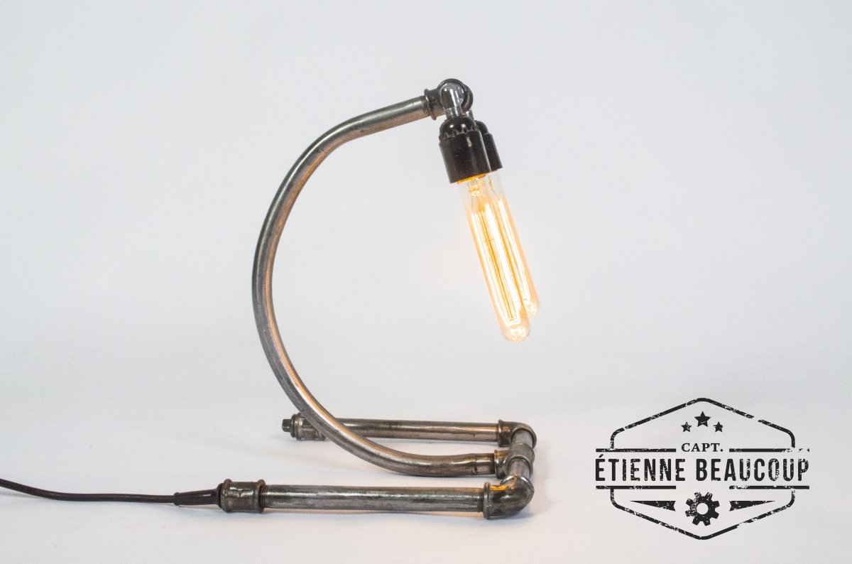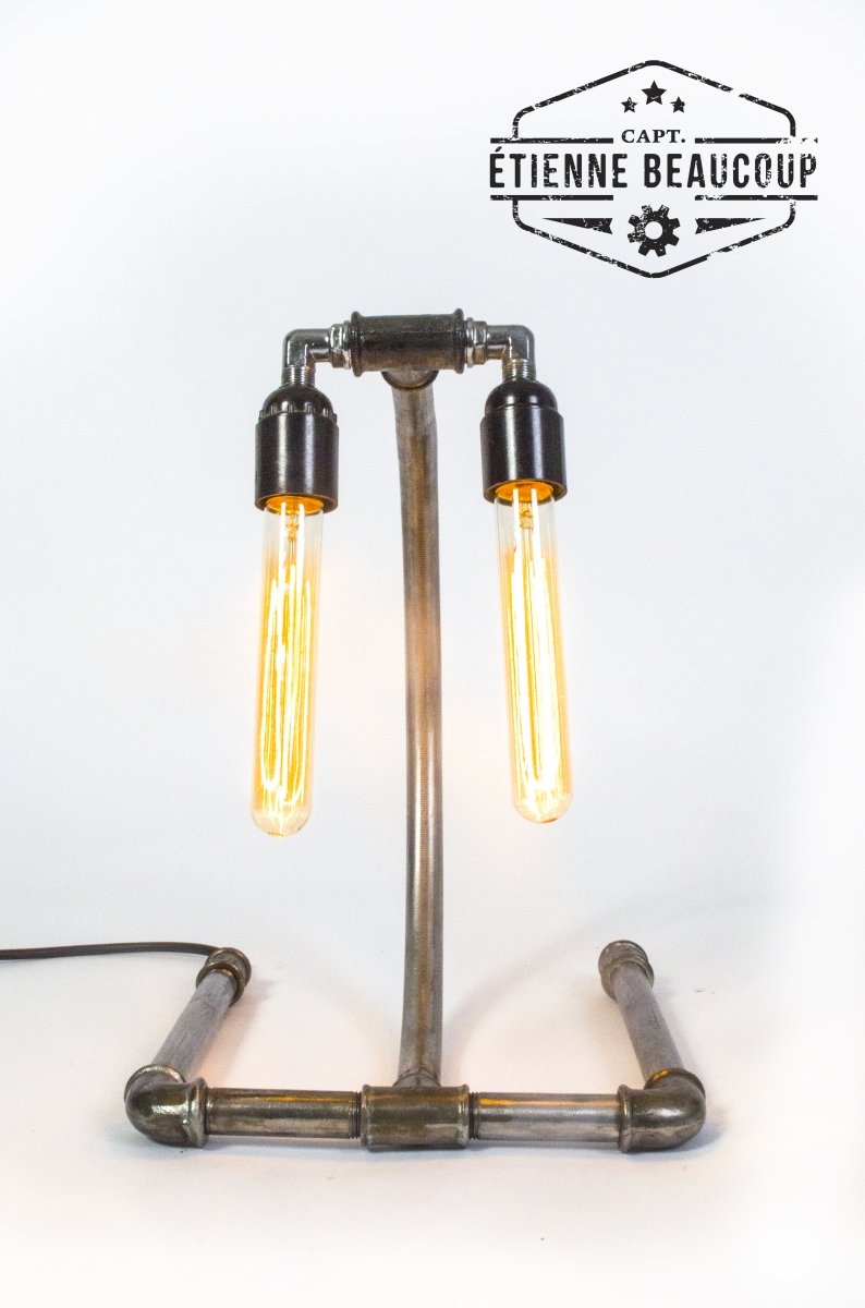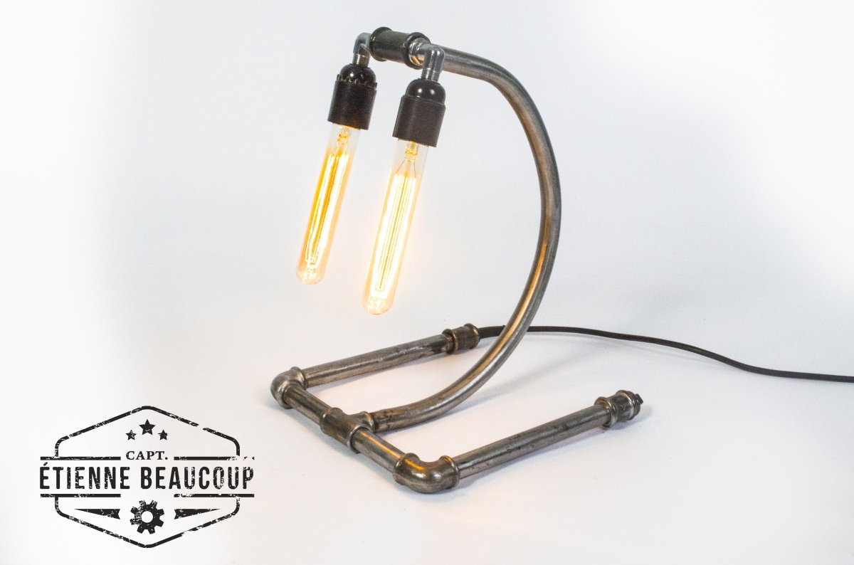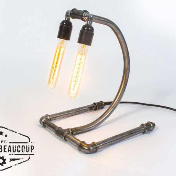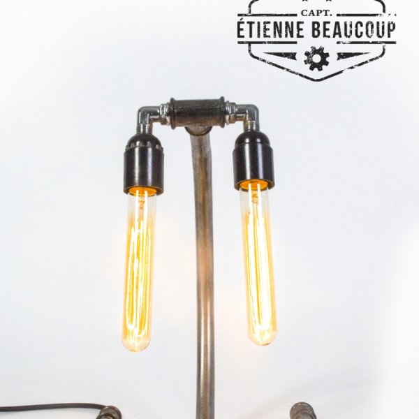 De 'Scorpion' of Schorpioen is een handgemaakte industriële tafellamp is vervaardigd uit oude stalen loodgietersbuizen en koppelingen. Bij deze lamp passen de 2 speciale Edison buislampen zichtbaar op de foto. deze zijn verkrijgbaar in de meeste bouwmarkten.