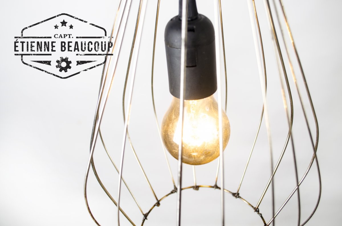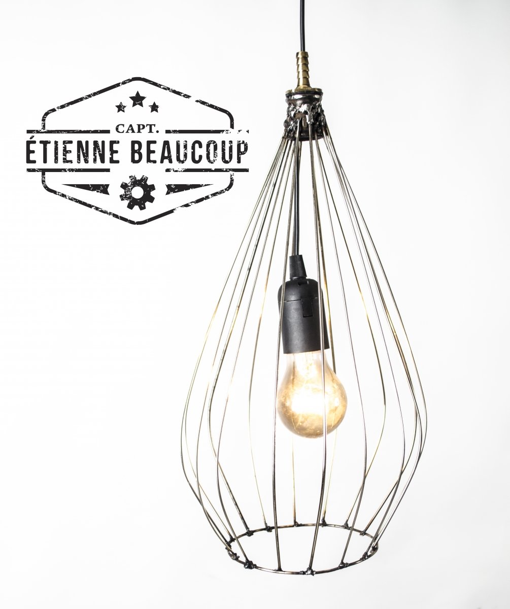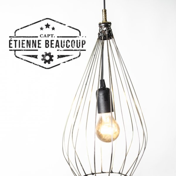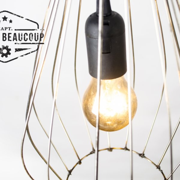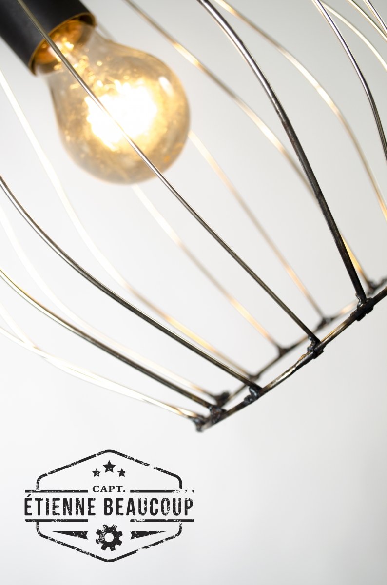 Deze hanglamp is gemaakt uit inox breinaalden die zachtjes werden gebogen. Het is een eerste poging om een cagelamp te creëren. de naalden lieten zich echter niet zo eenvoudig buigen en smelten gemakkelijk weg bij het lassen, daardoor is de lamp niet mooi symmetrisch.