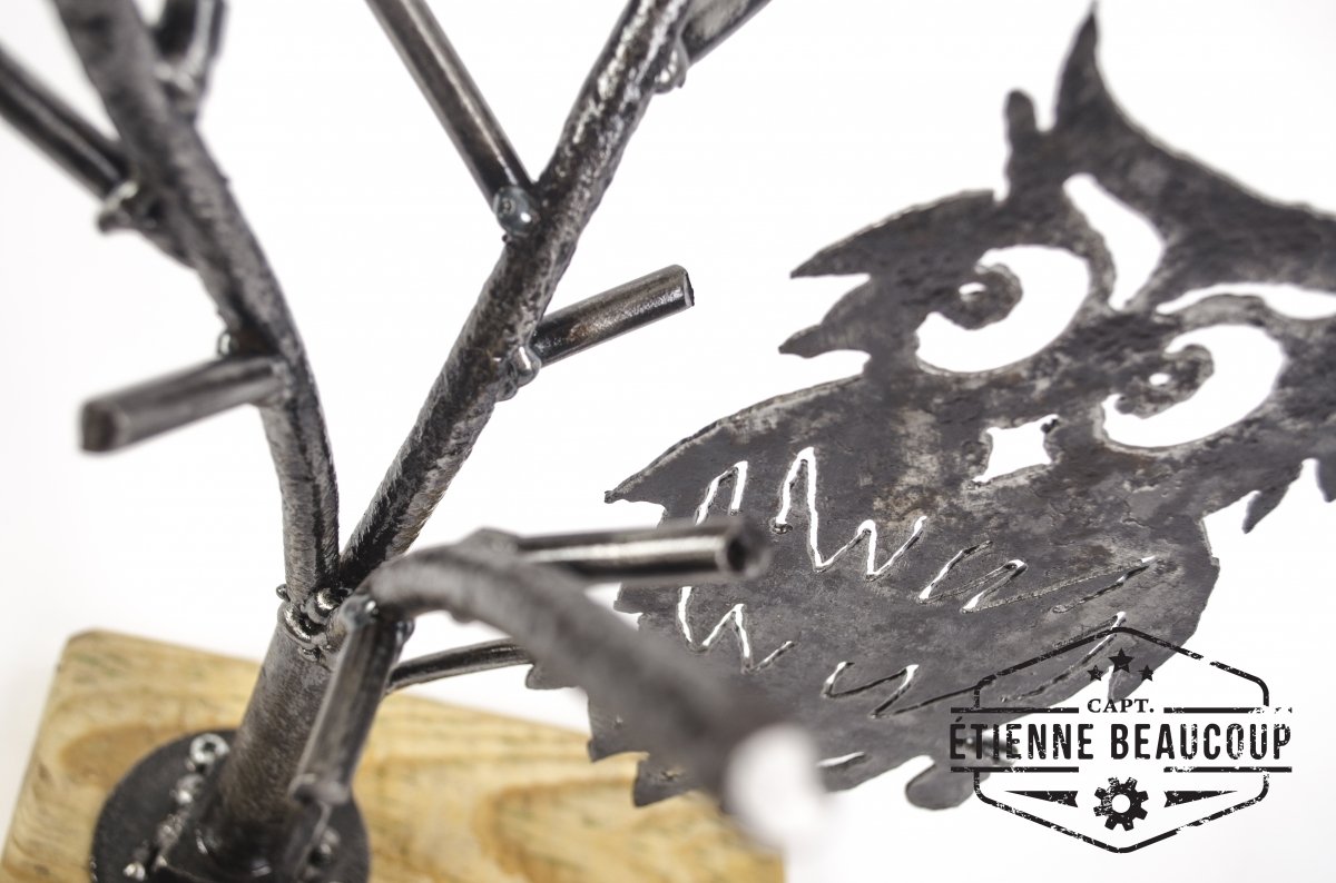 Dit decoratief beeld werd met de hand uitgesneden uit recuperatiemetaal. De boom is opbebouwd uit stukjes herbruikt betonijzer op een stam van een dikke bout.