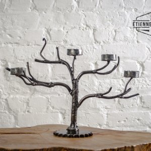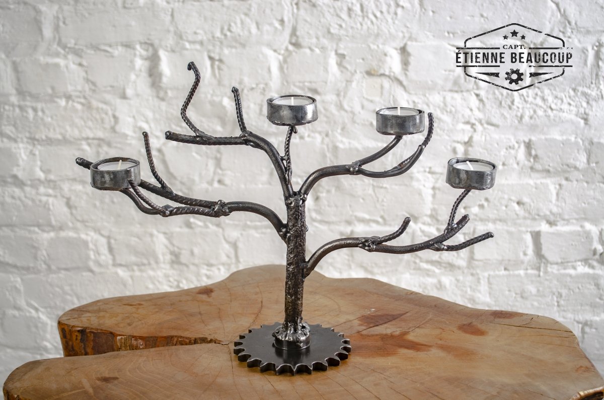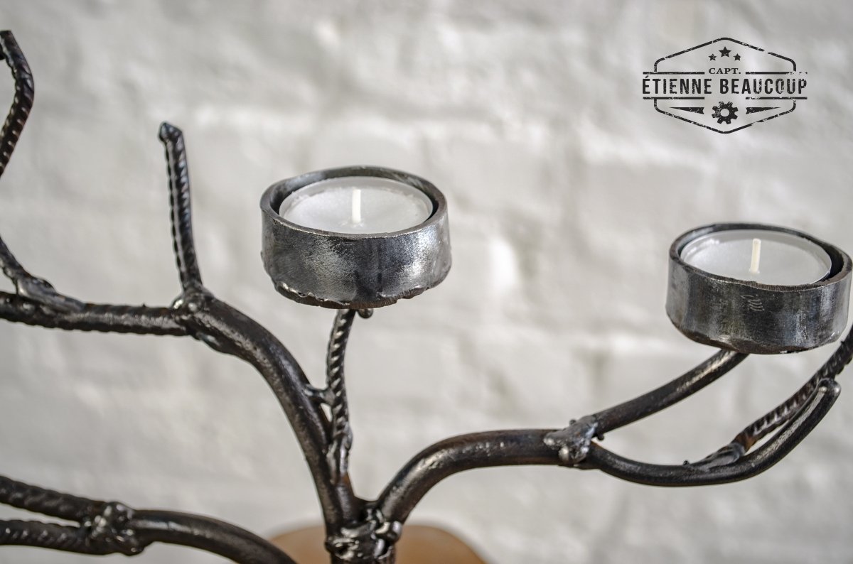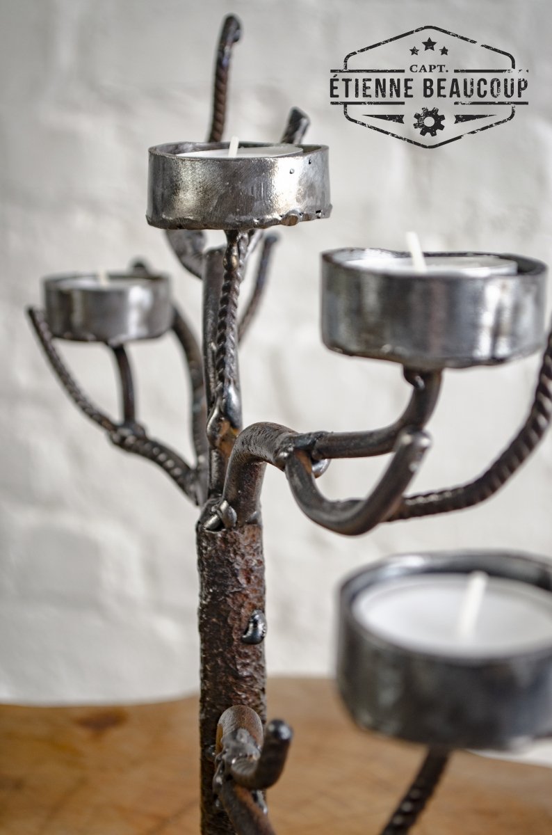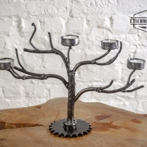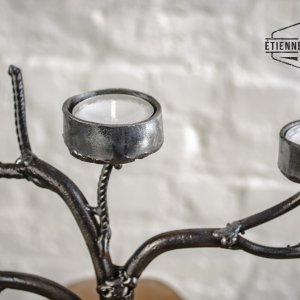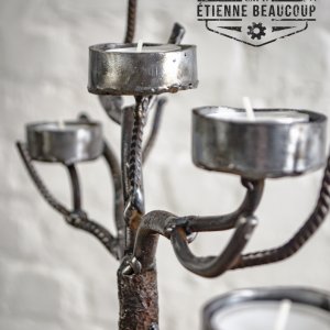 Kandelaar voor 4 theelichtjes gemaakt van betonijzers en een oud tandwiel.
