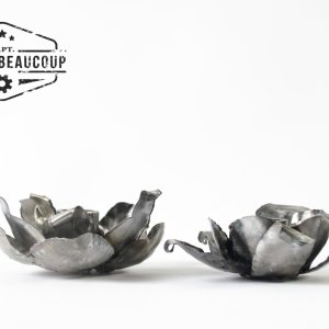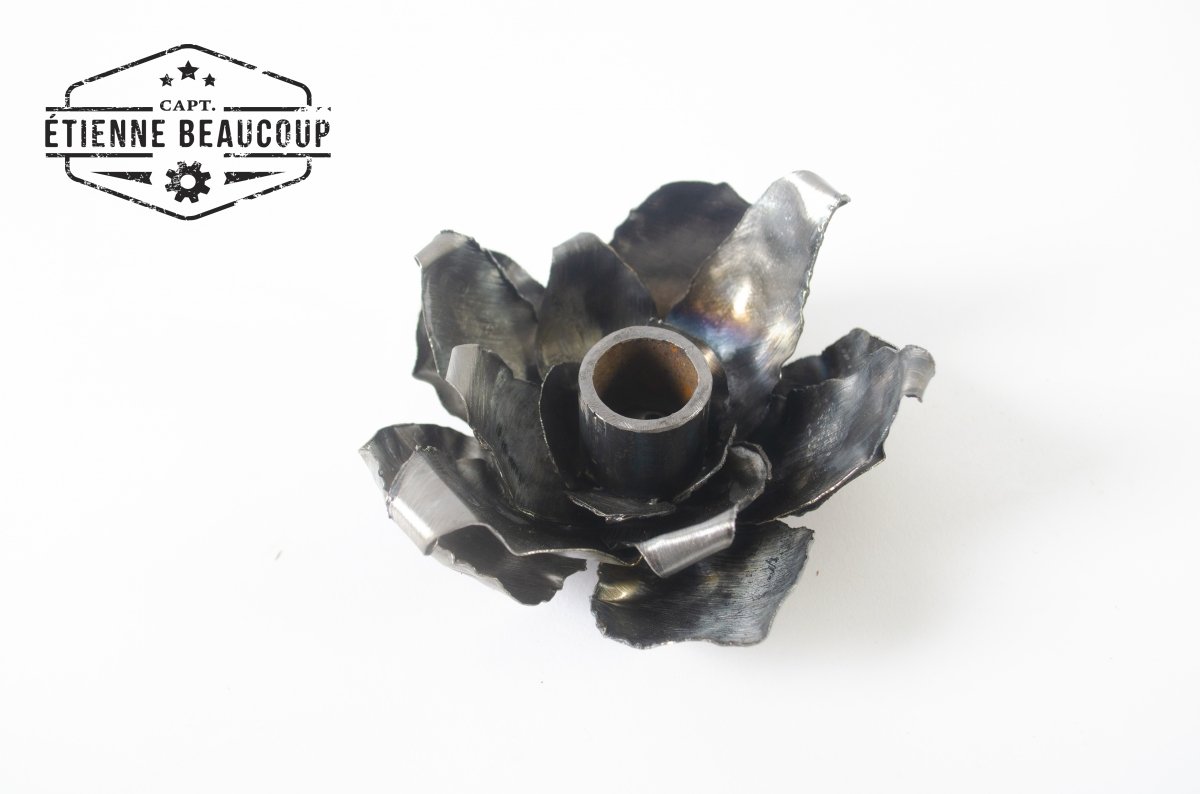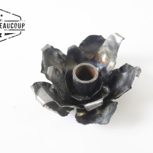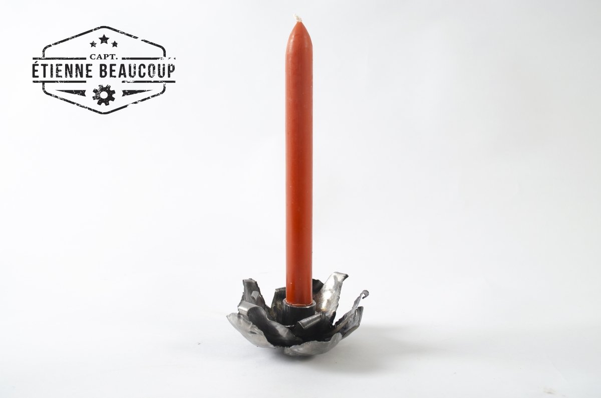 Candleholder in the shape of a flower made from recycled metal from an old metal storage rack.