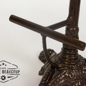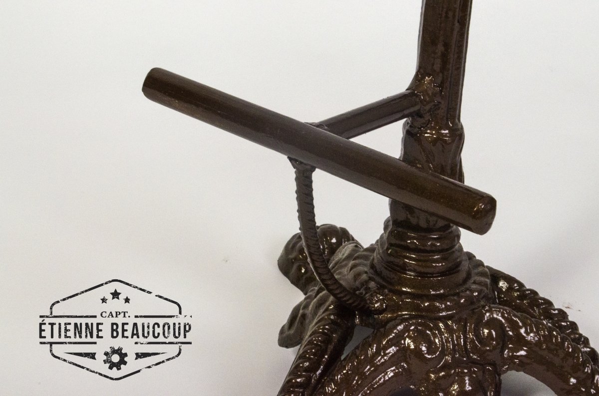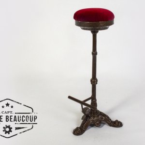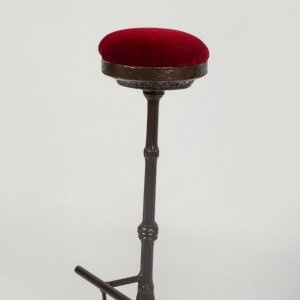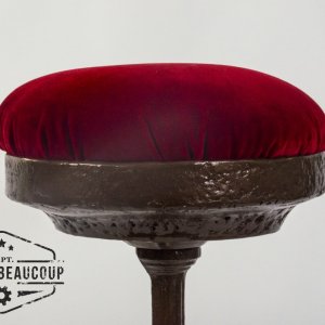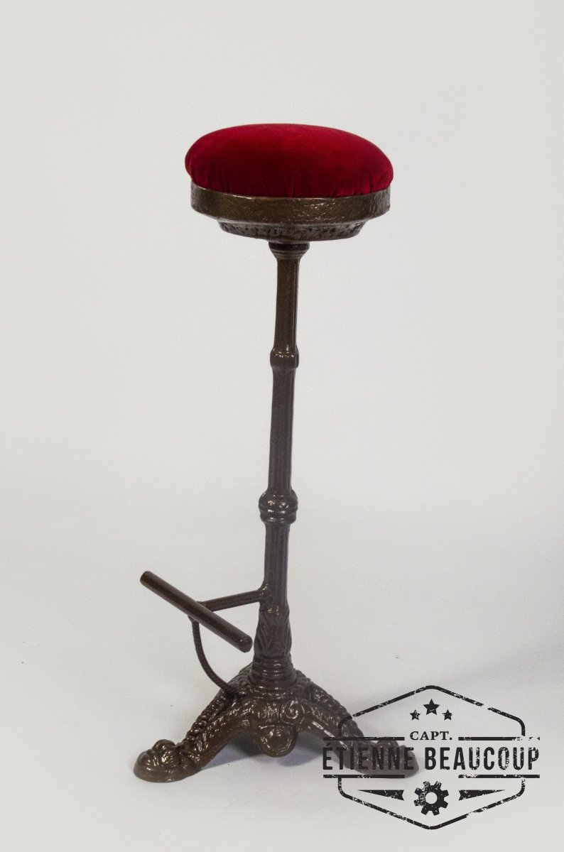 This barstool is manufactured from an old table with a marble tablet. The seat is a piece of an old disused fire pit and a velvet curtain