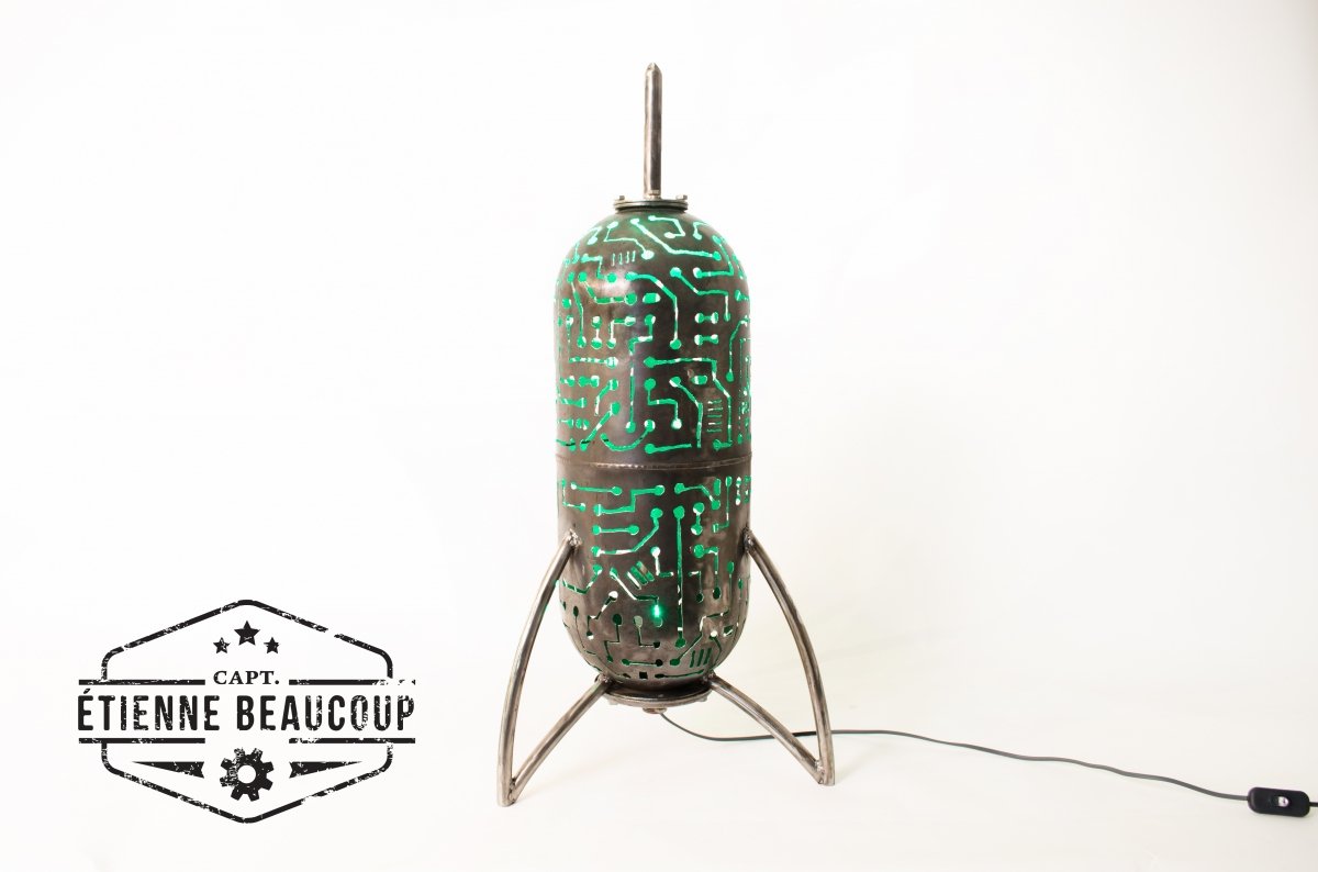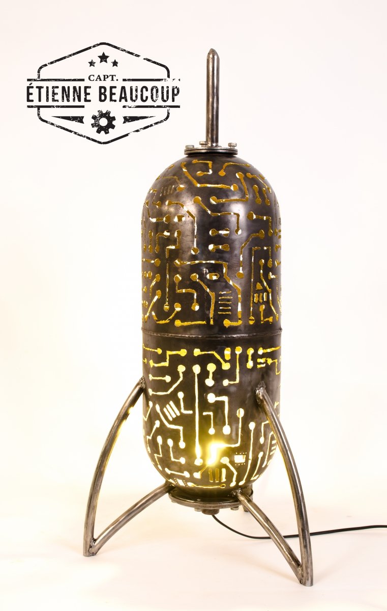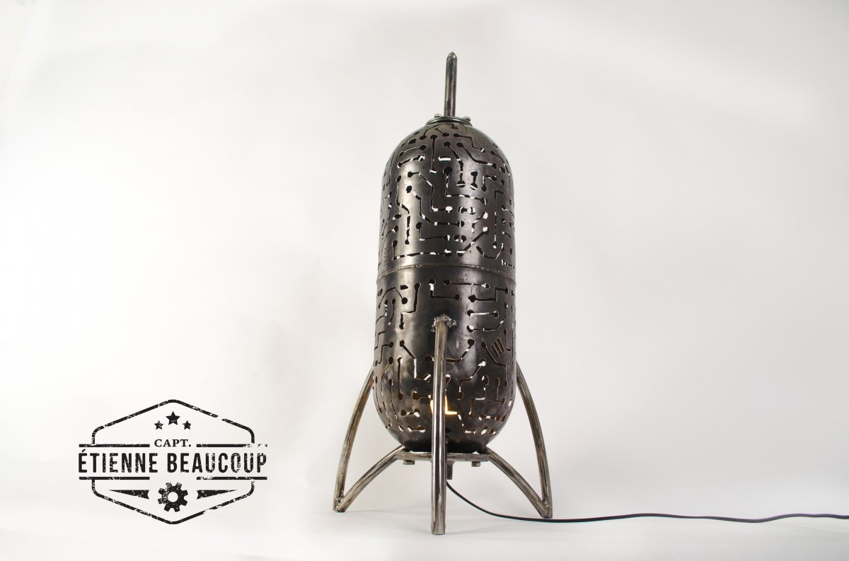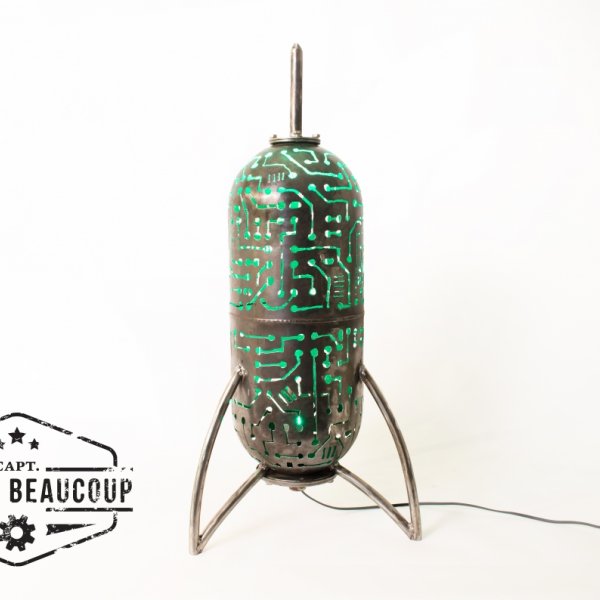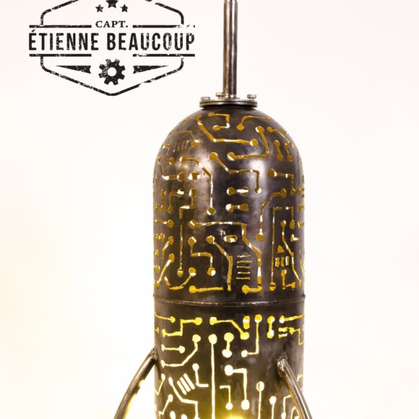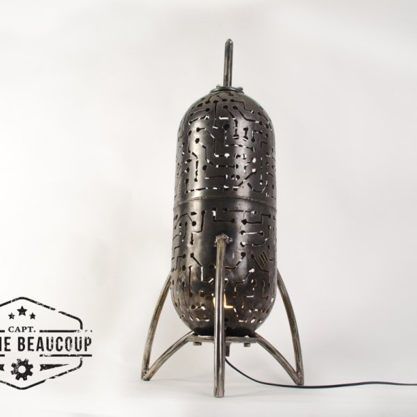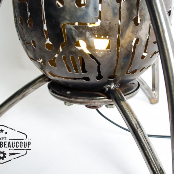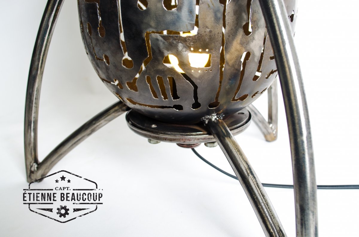 This retrofuturistic atmospheric lamp is built from an old expansion tank of a water pump. The drawing was made by hand and cut out with the plasma cutter.The lamp has a normal E27 socket, so that different lamps are possible.We had the best result with a color-changing LED spot.
