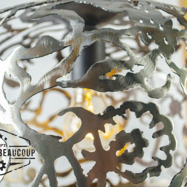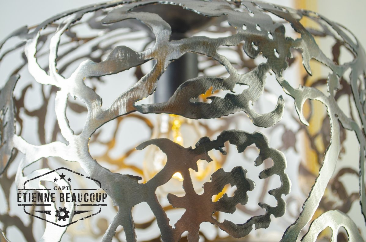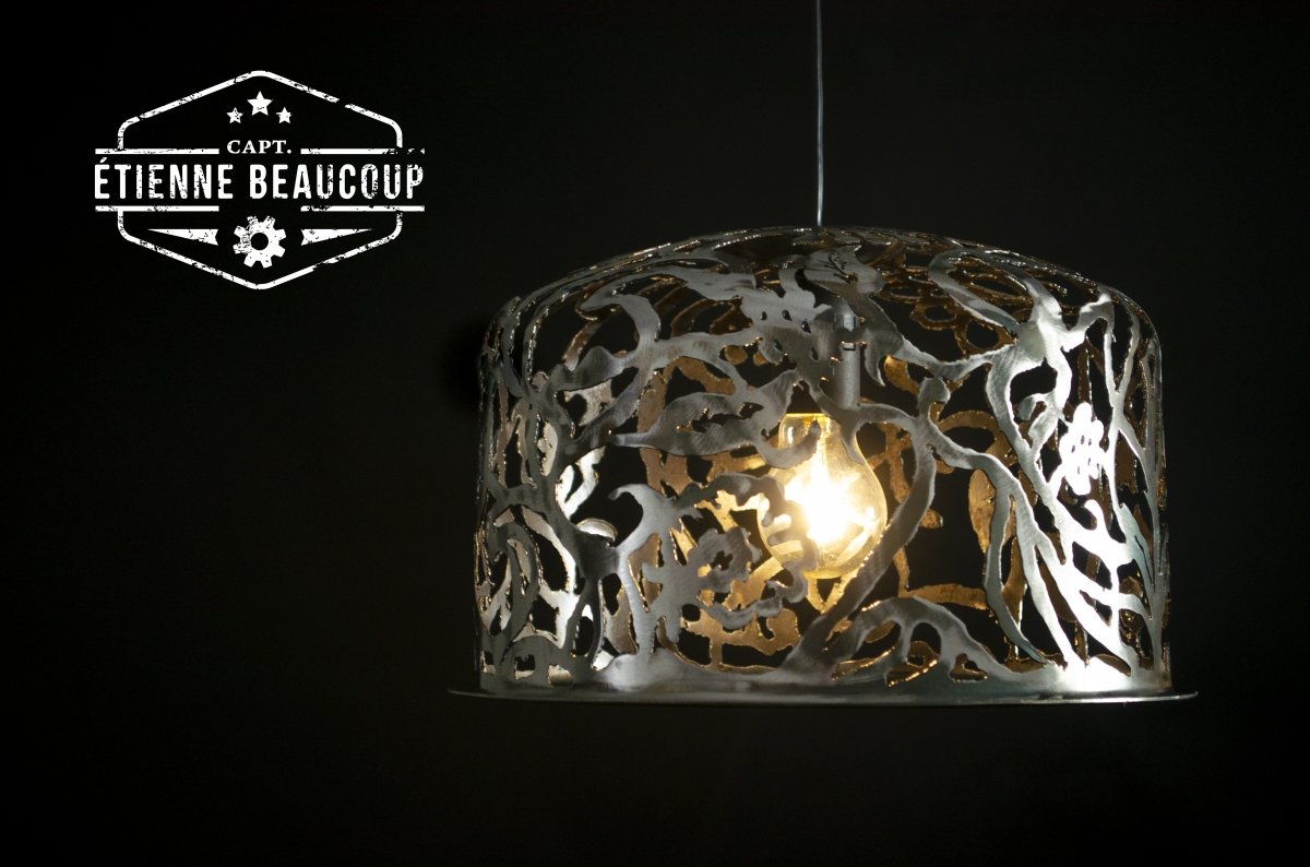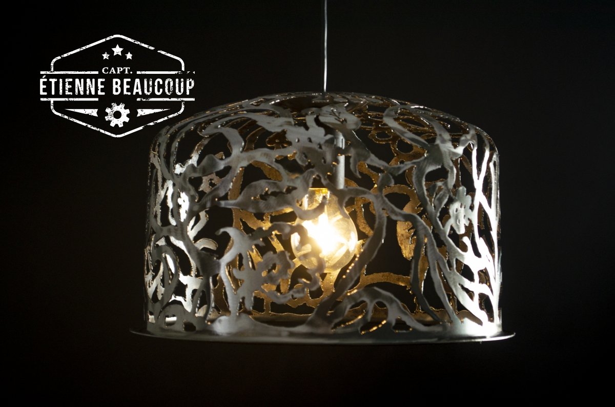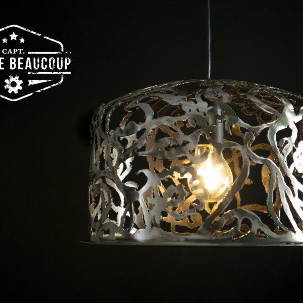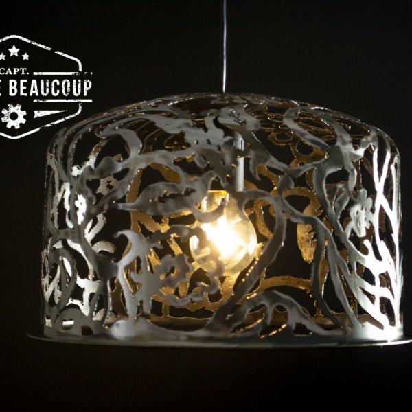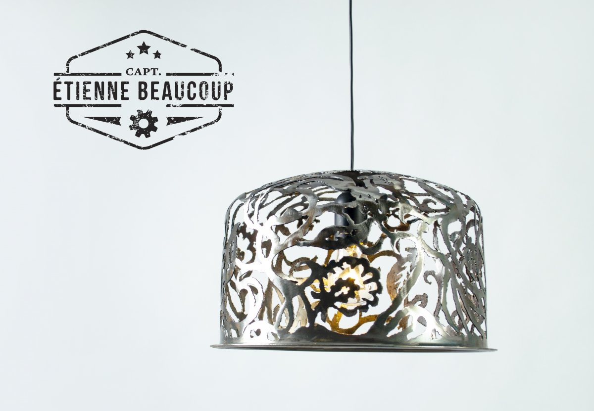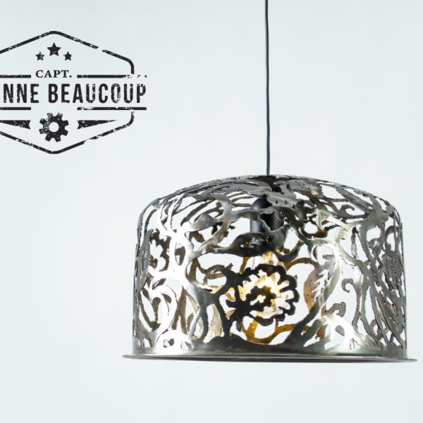 This pendant lamp was cut by hand from half a recovered expansion tank.
