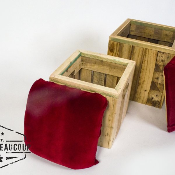 This sittingbox is made from reclaimed wooden pallets. Finished with garden furniture oil. The seat is a piece of an old velvet curtain. The seat can be taken of and can be used as a box.