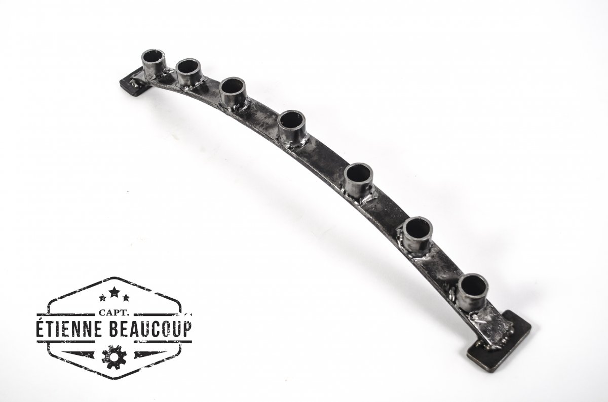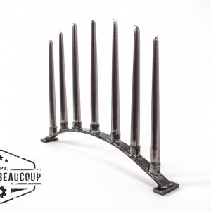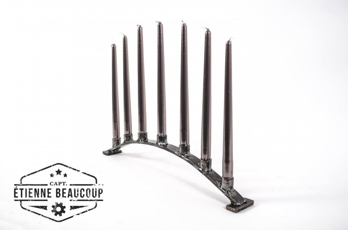 Kandelaar voor 7 buffet kaarsen gemaakt uit recuperatie metaal. de houders zijn oude verwarmingsbuizen, de voet is een oude ijzeren paal die jaren dienst deed als tuinafsluiting.