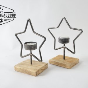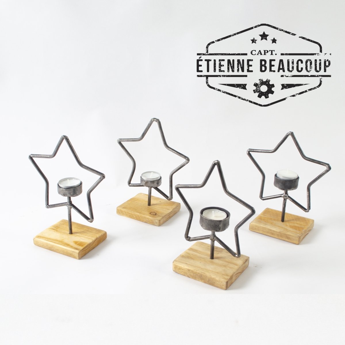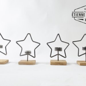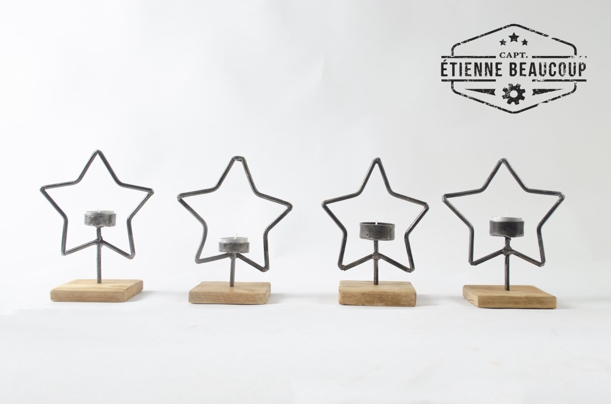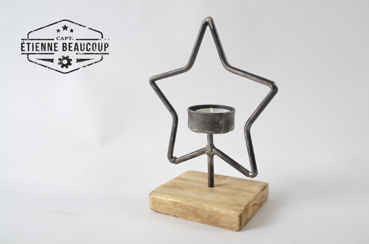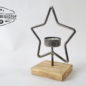Stervormige kandelaar voor een theelichtje uit betonijzer op een stukje palettenhout.